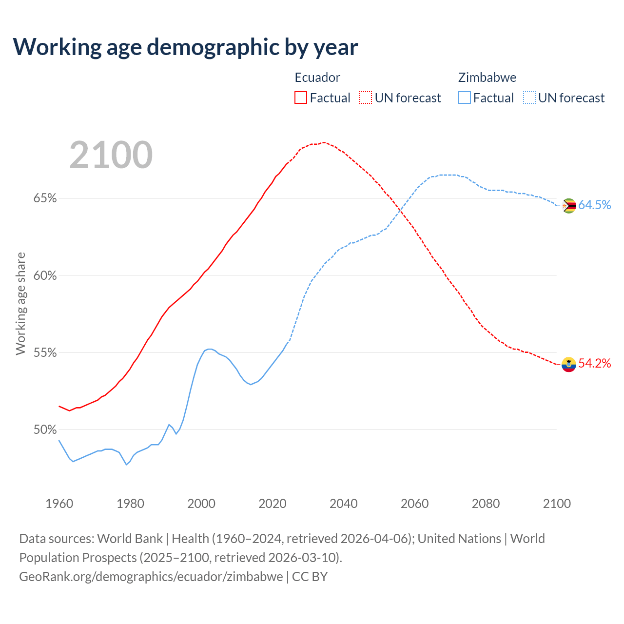 - The share of old-age demographic (65+) in Ecuador is 8.34% vs 3.6% in Zimbabwe.