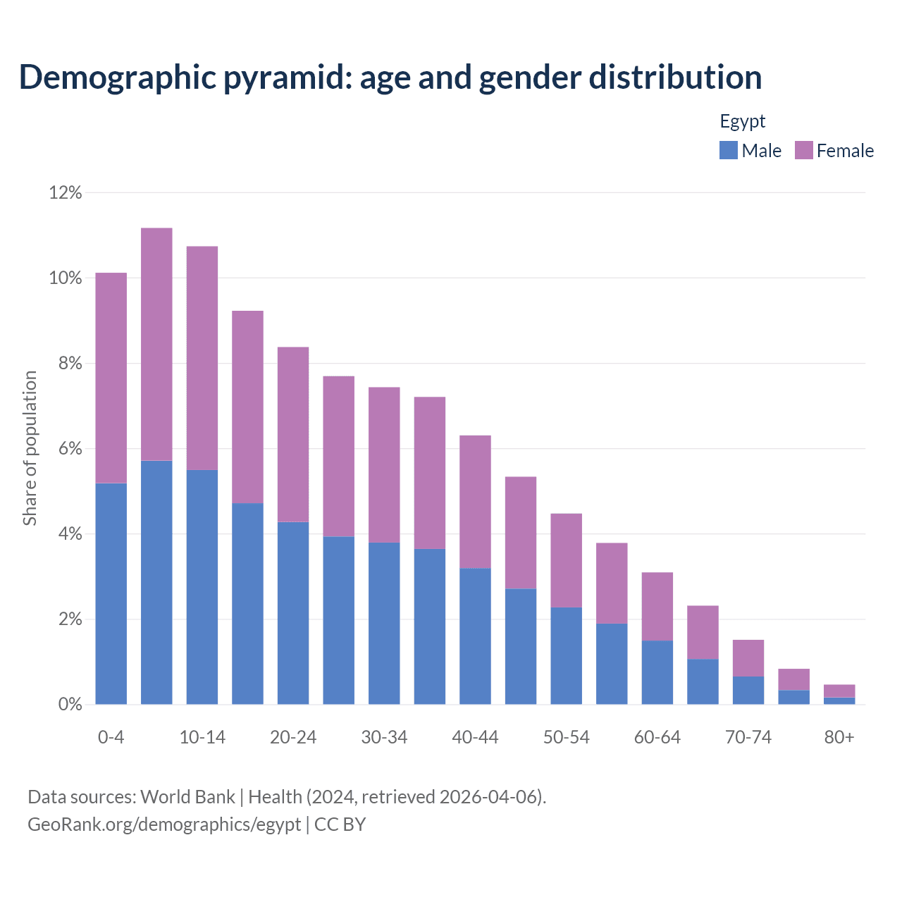 With a population of 117M people, Egypt has a median age of 25.3 years which makes it the 133/196 oldest country. 32% of the demographic are children 0-14 years old, 62.9% are working-age people aged 15-64, and 5.12% are older population aged 65+ years.