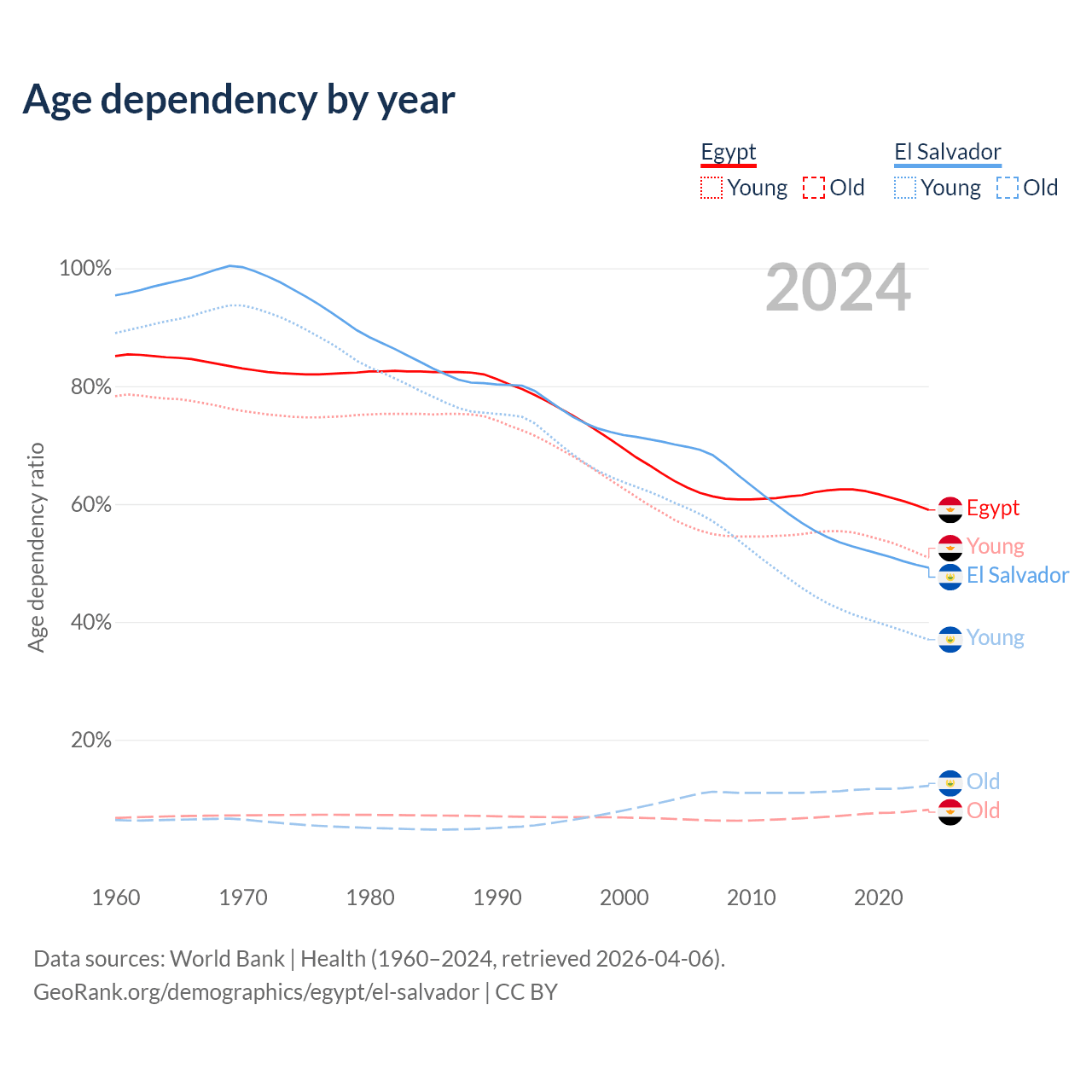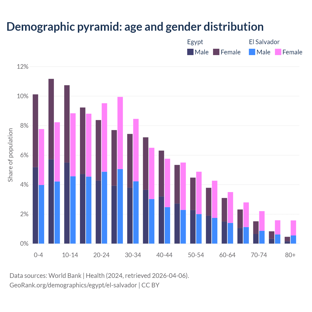 - Egypt is ranked 133/196 by median age (oldest to youngest) vs 115/196 for El Salvador.