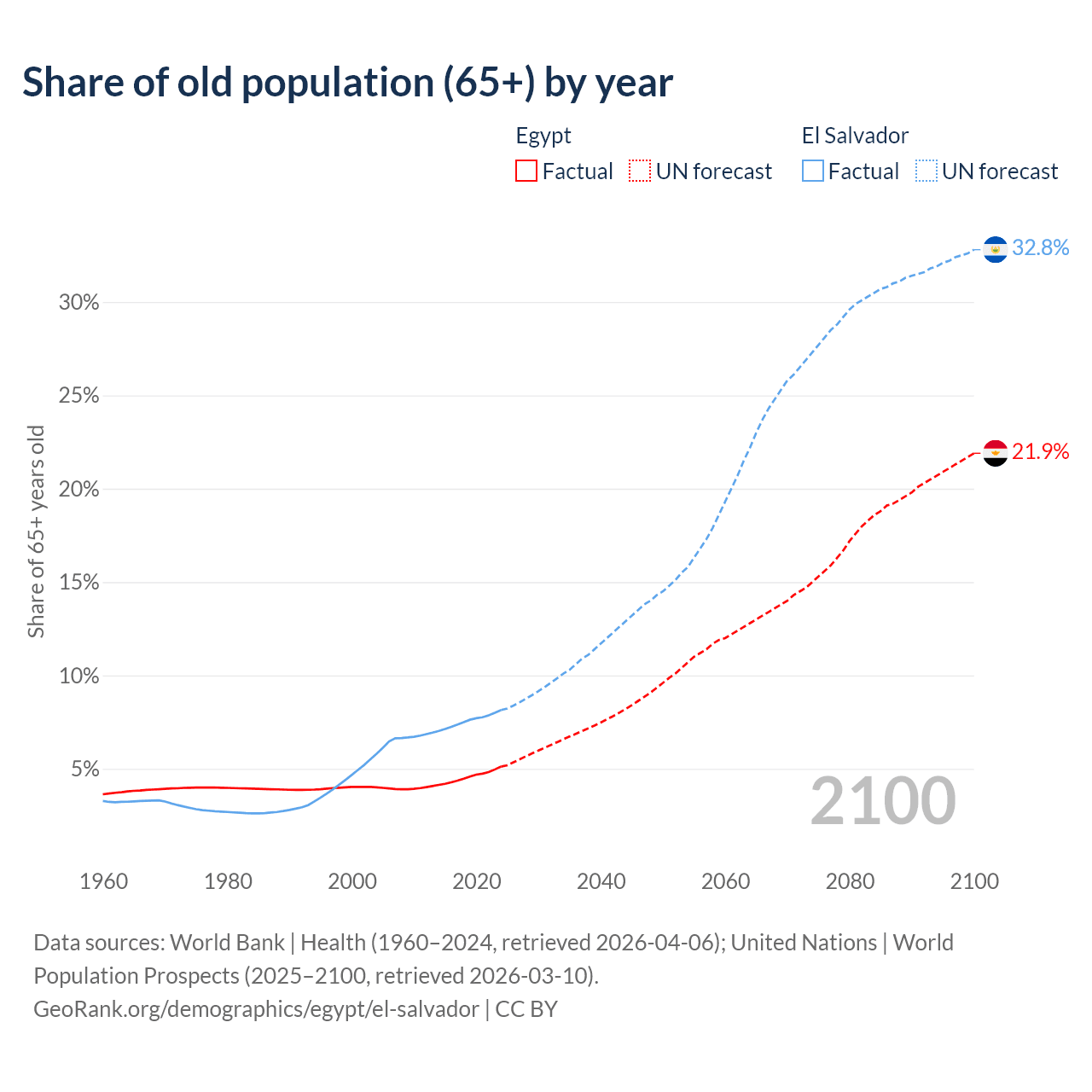 The share of older people aged 65 and over is 5.12% in Egypt and 8.15% in El Salvador. Life expectancy in Egypt compared to El Salvador .