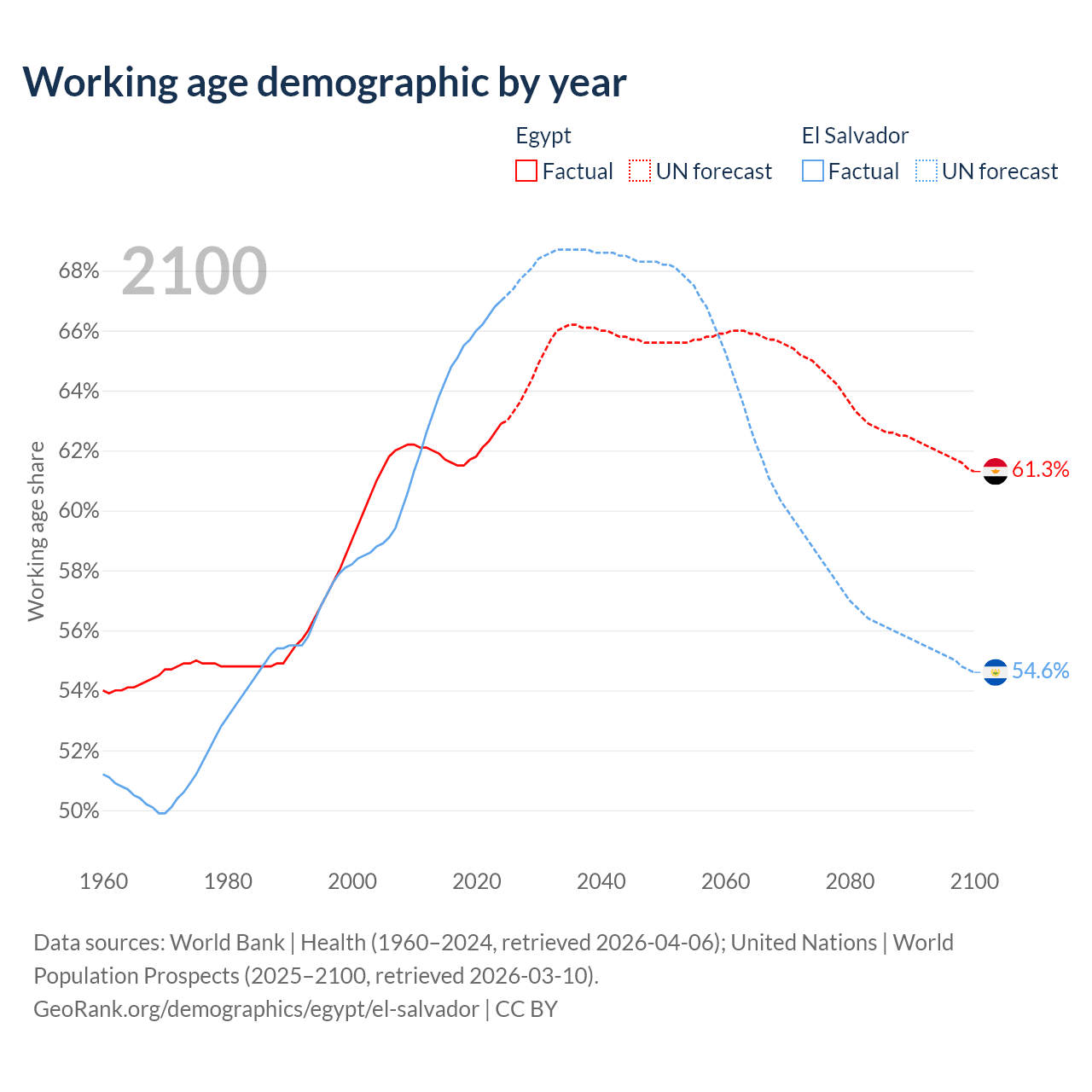 - Egypt has 75.9M working age adults (aged 15-64) vs 4.29M in El Salvador.