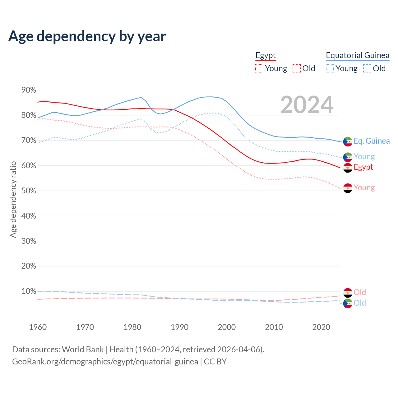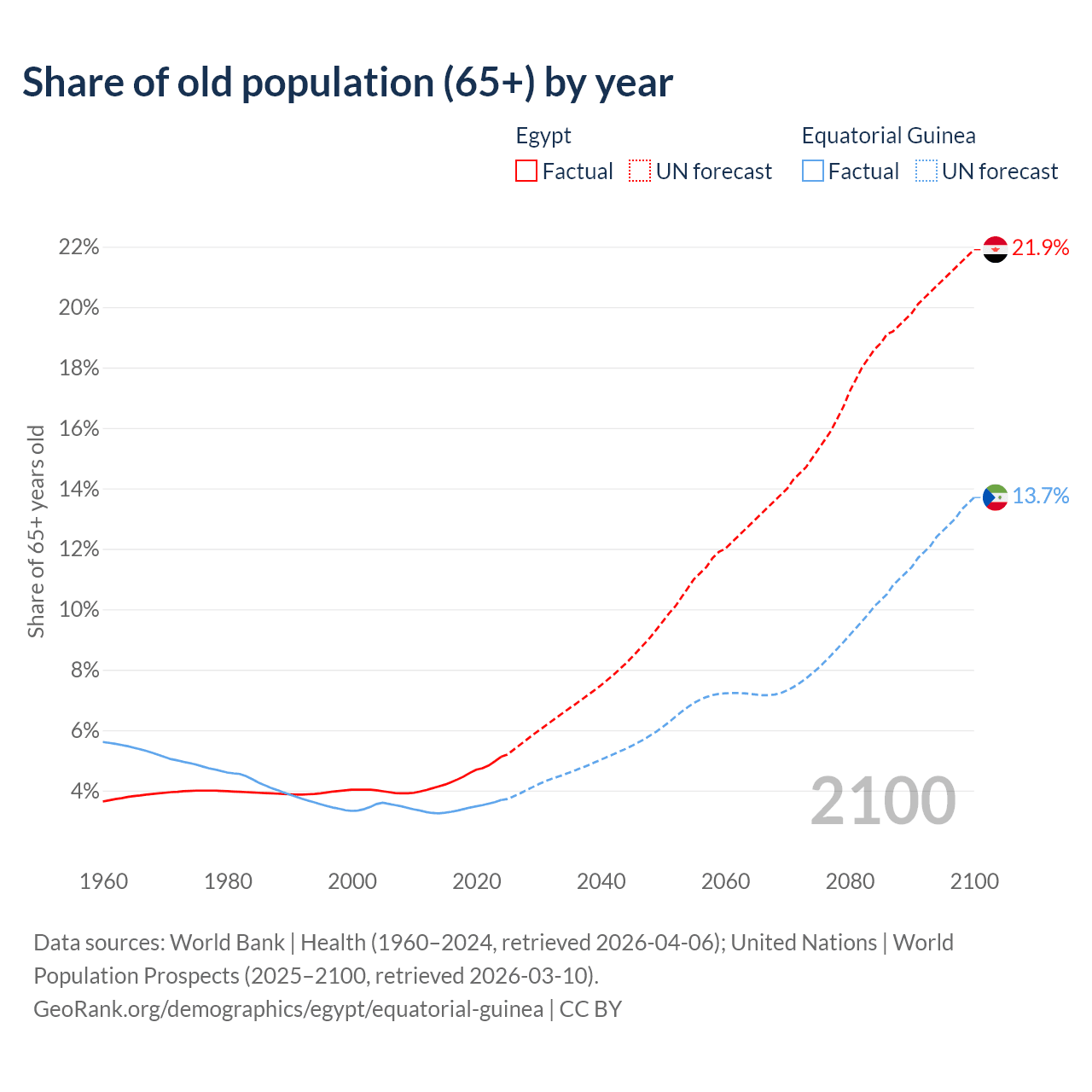 The share of older people aged 65 and over is 5.12% in Egypt and 3.69% in Equatorial Guinea. Life expectancy in Egypt compared to Equatorial Guinea .