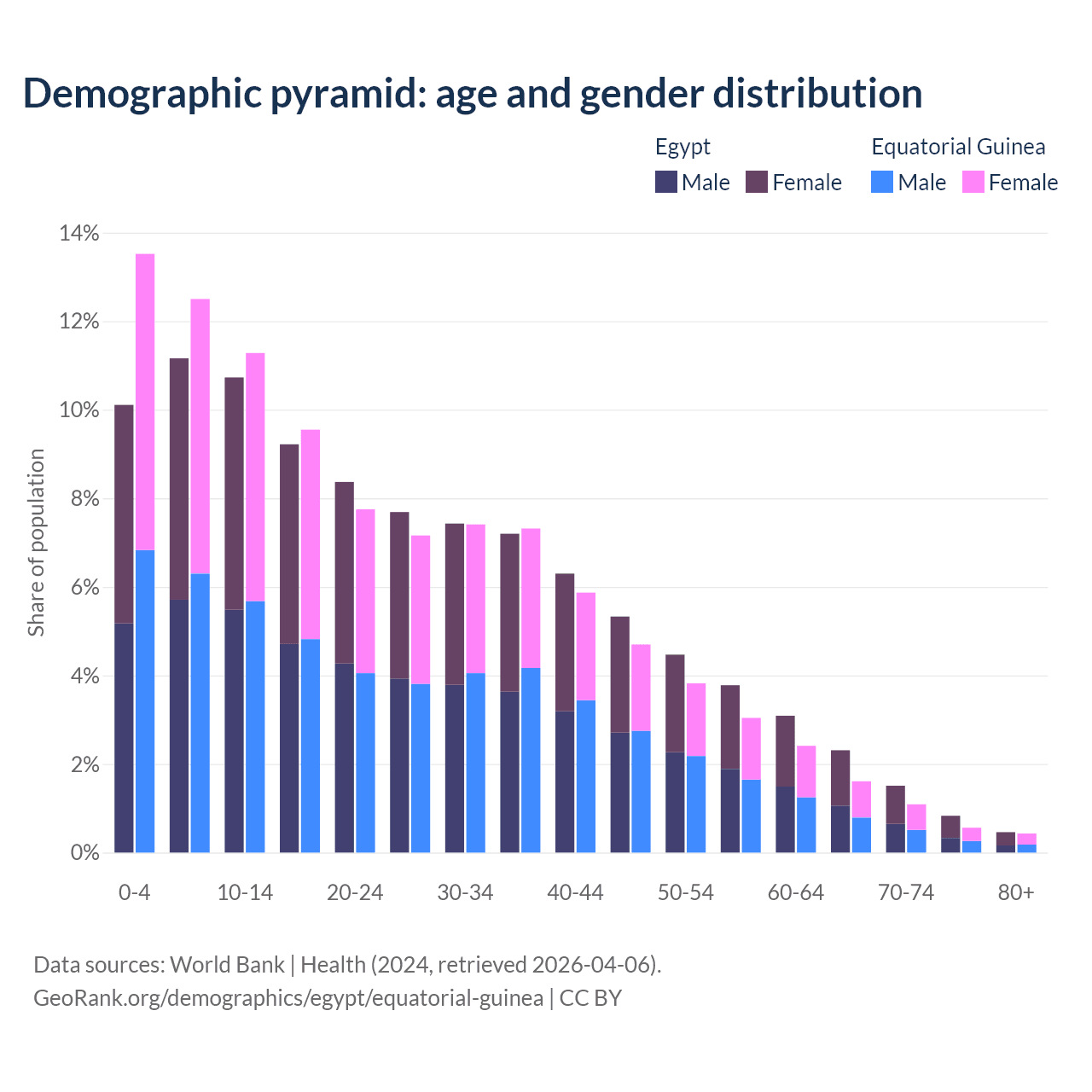 - Egypt is ranked 133/196 by median age (oldest to youngest) vs 148/196 for Equatorial Guinea.