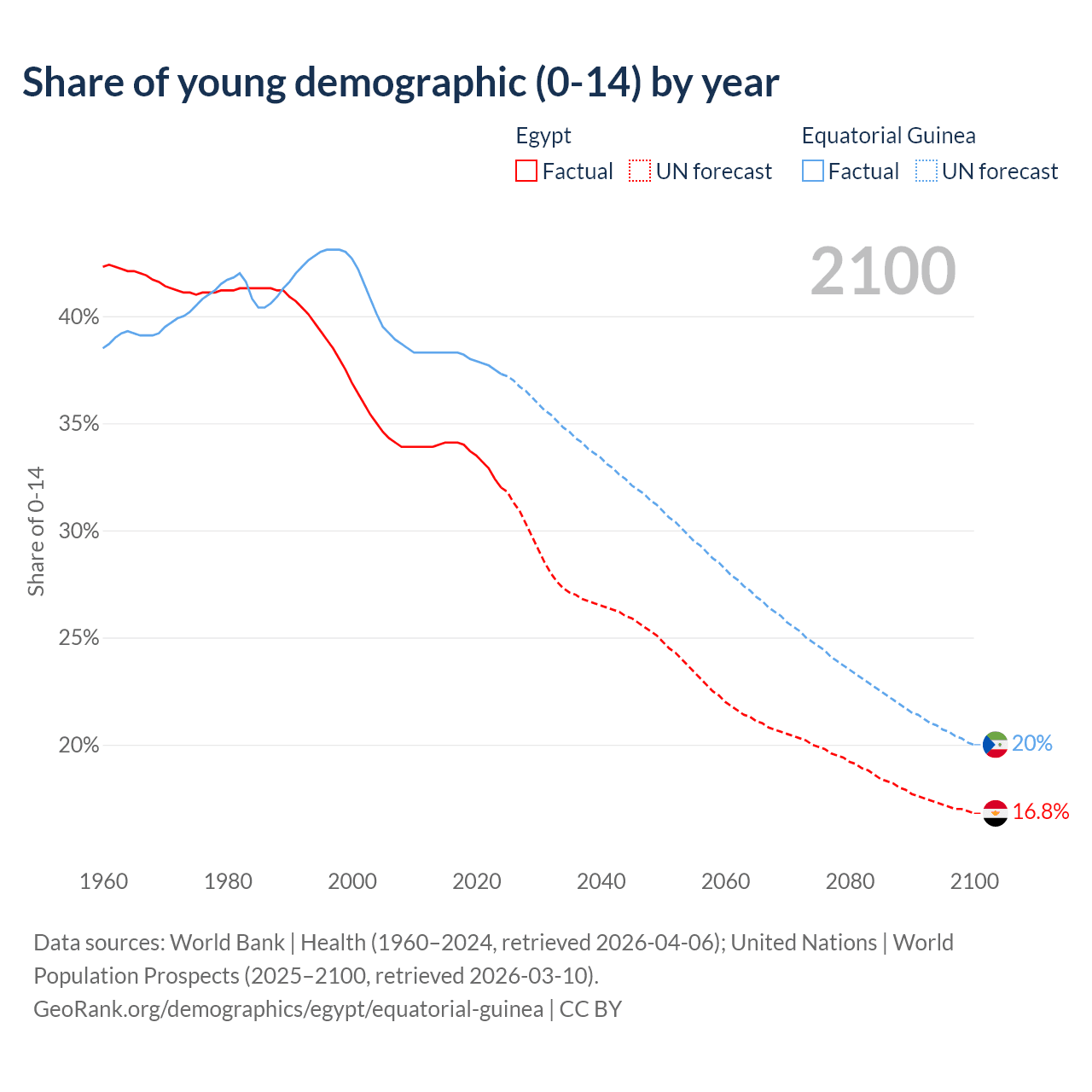 - The share of young demographic (0-15 years old) in Egypt is 32% vs 37.3% in Equatorial Guinea.