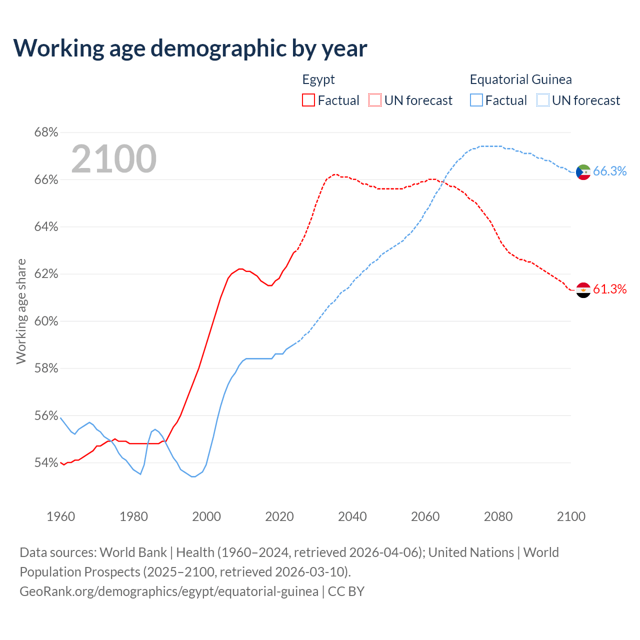 - Egypt has 75.9M working age adults (aged 15-64) vs 1.18M in Equatorial Guinea.