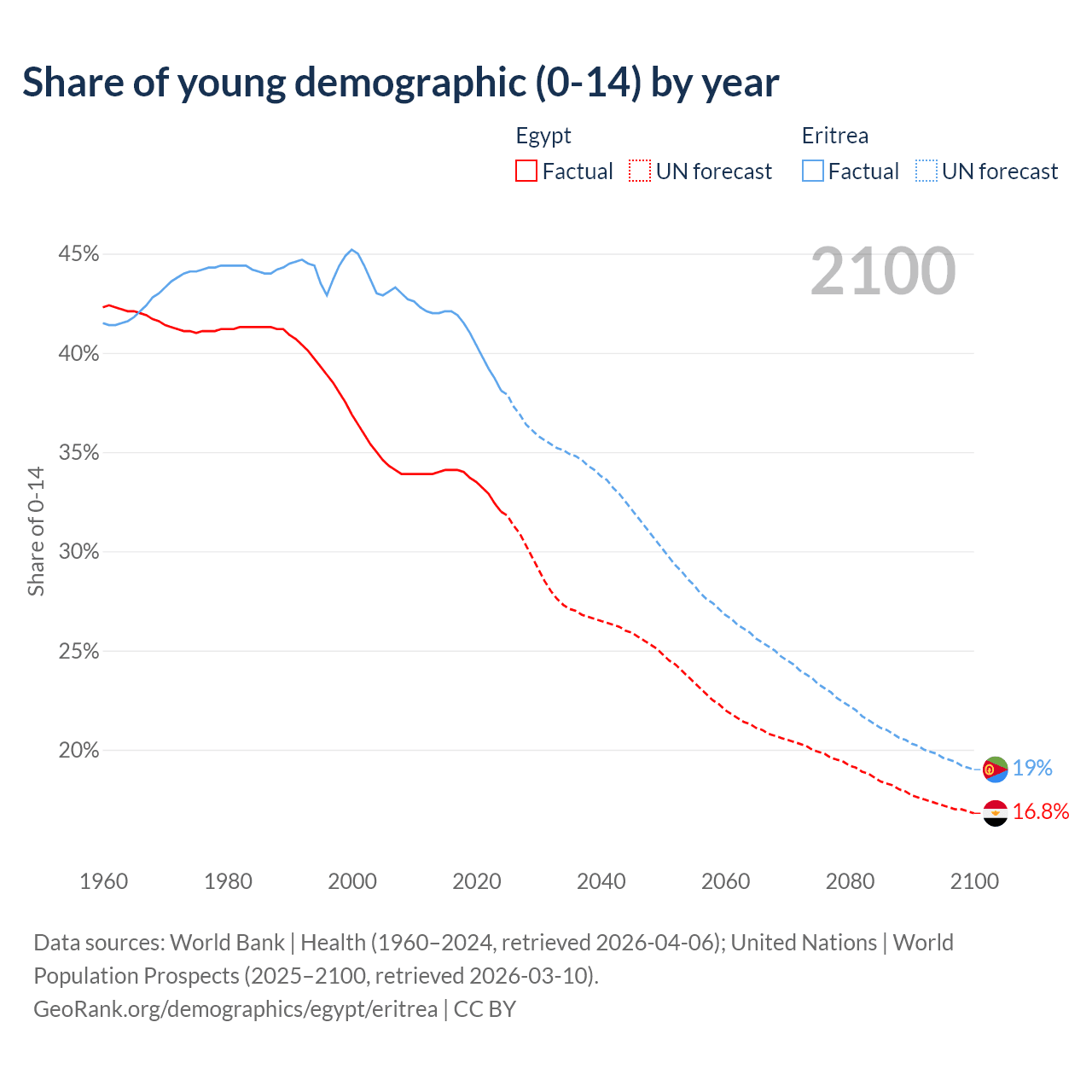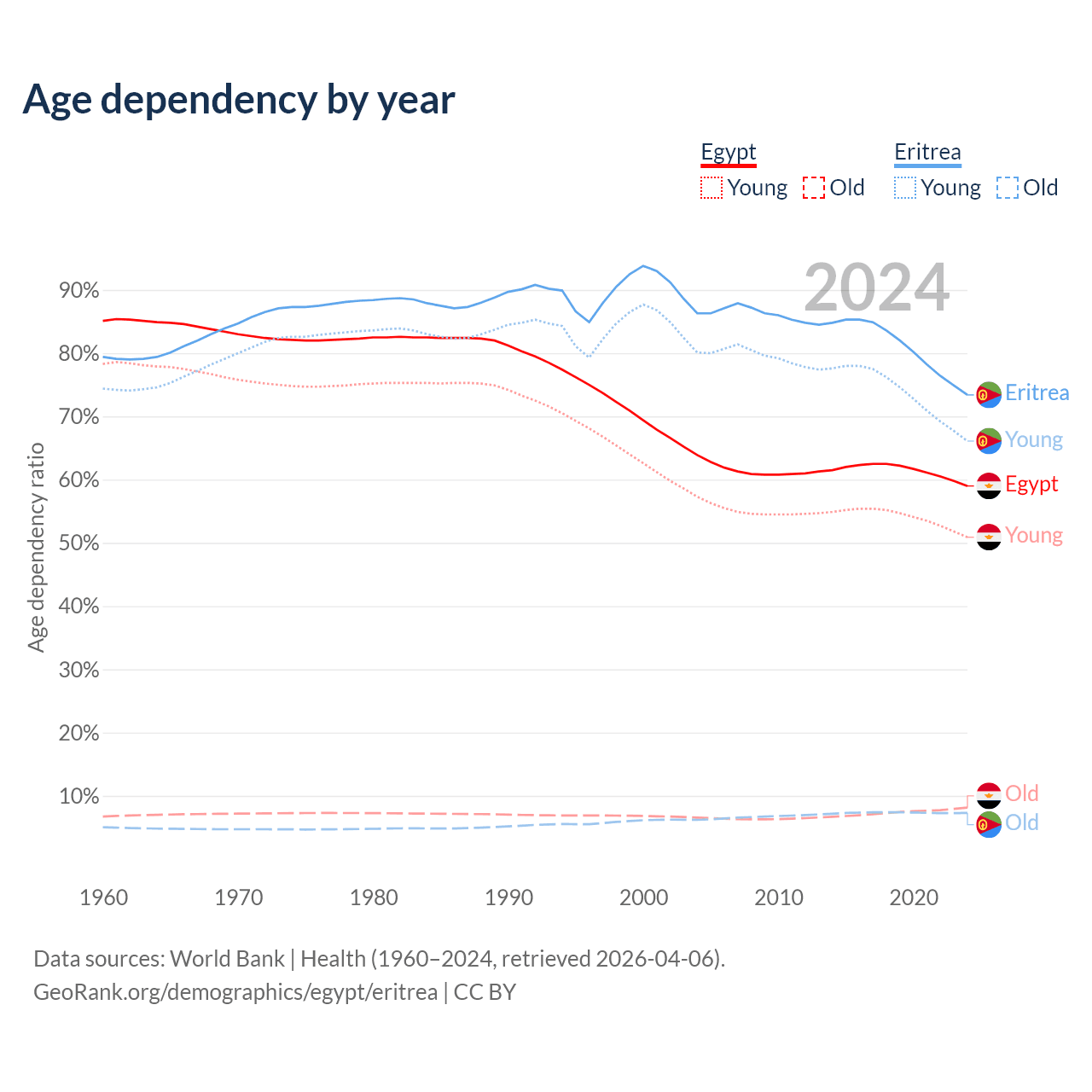 - Egypt is ranked 133/196 by median age (oldest to youngest) vs 168/196 for Eritrea.
