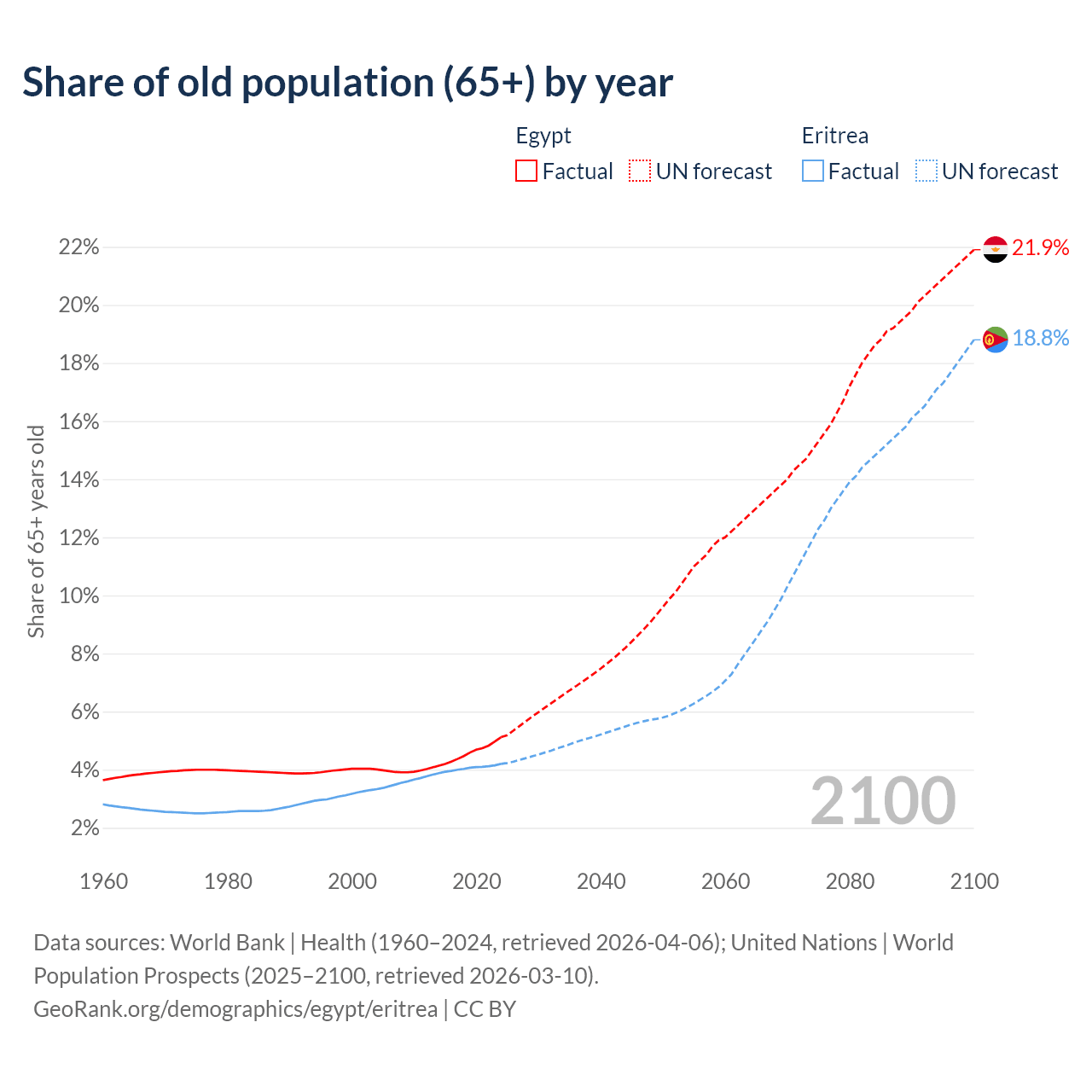 The share of older people aged 65 and over is 5.12% in Egypt and 4.2% in Eritrea. Life expectancy in Egypt compared to Eritrea .