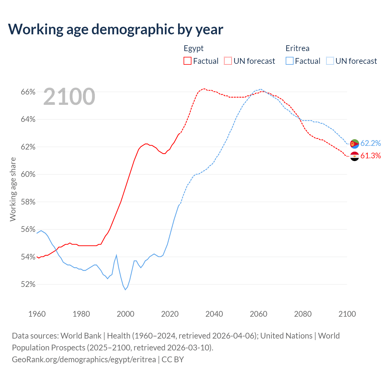 - Egypt has 75.9M working age adults (aged 15-64) vs 2.13M in Eritrea.