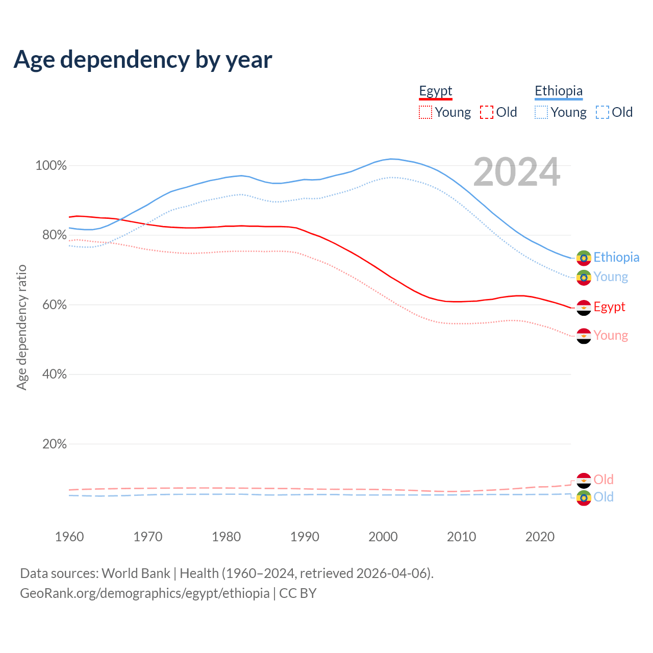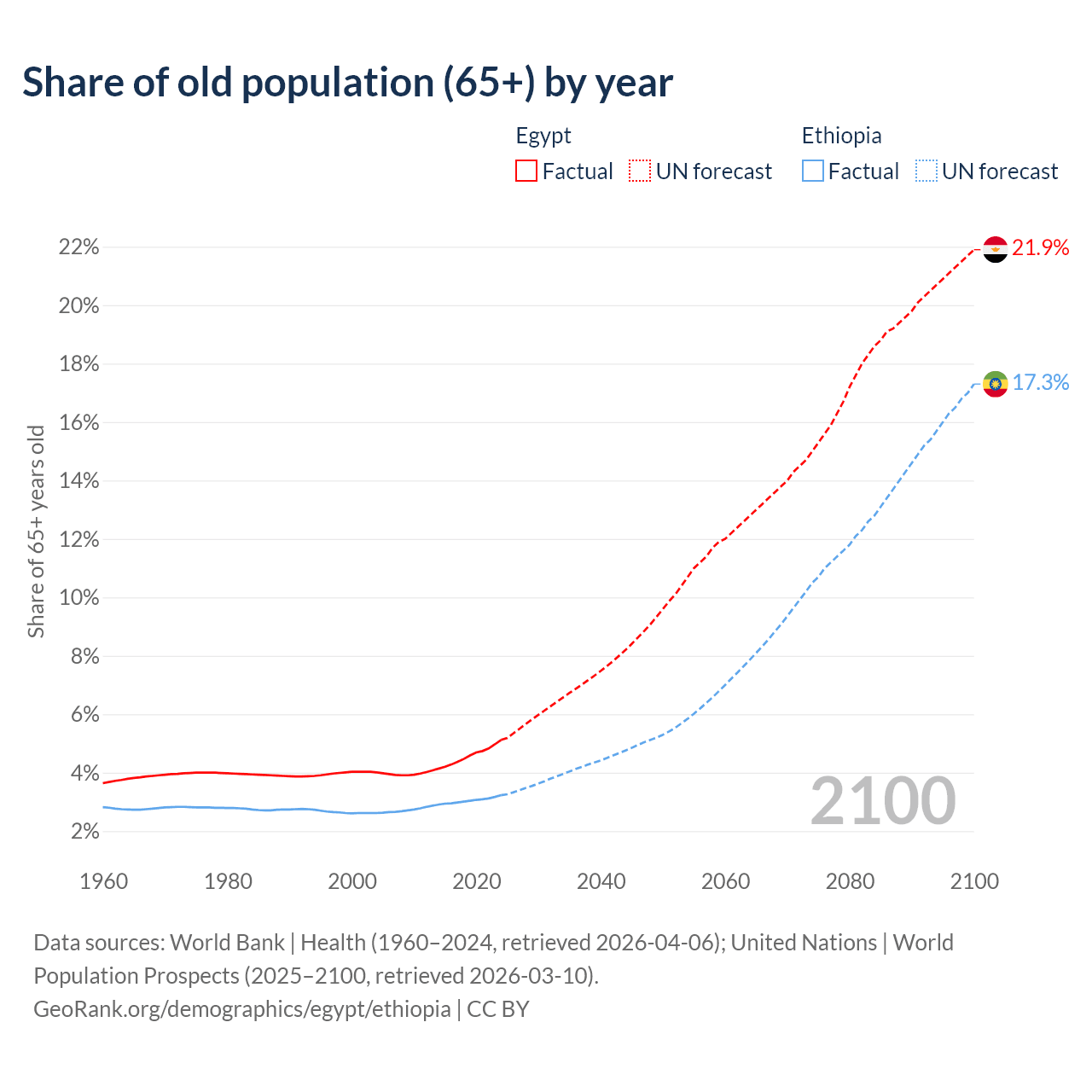 The share of older people aged 65 and over is 5.12% in Egypt and 3.23% in Ethiopia. Life expectancy in Egypt compared to Ethiopia .
