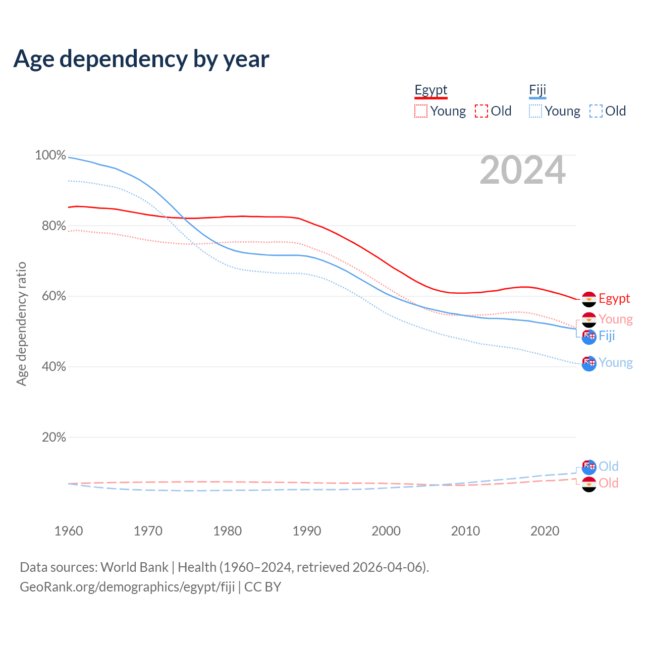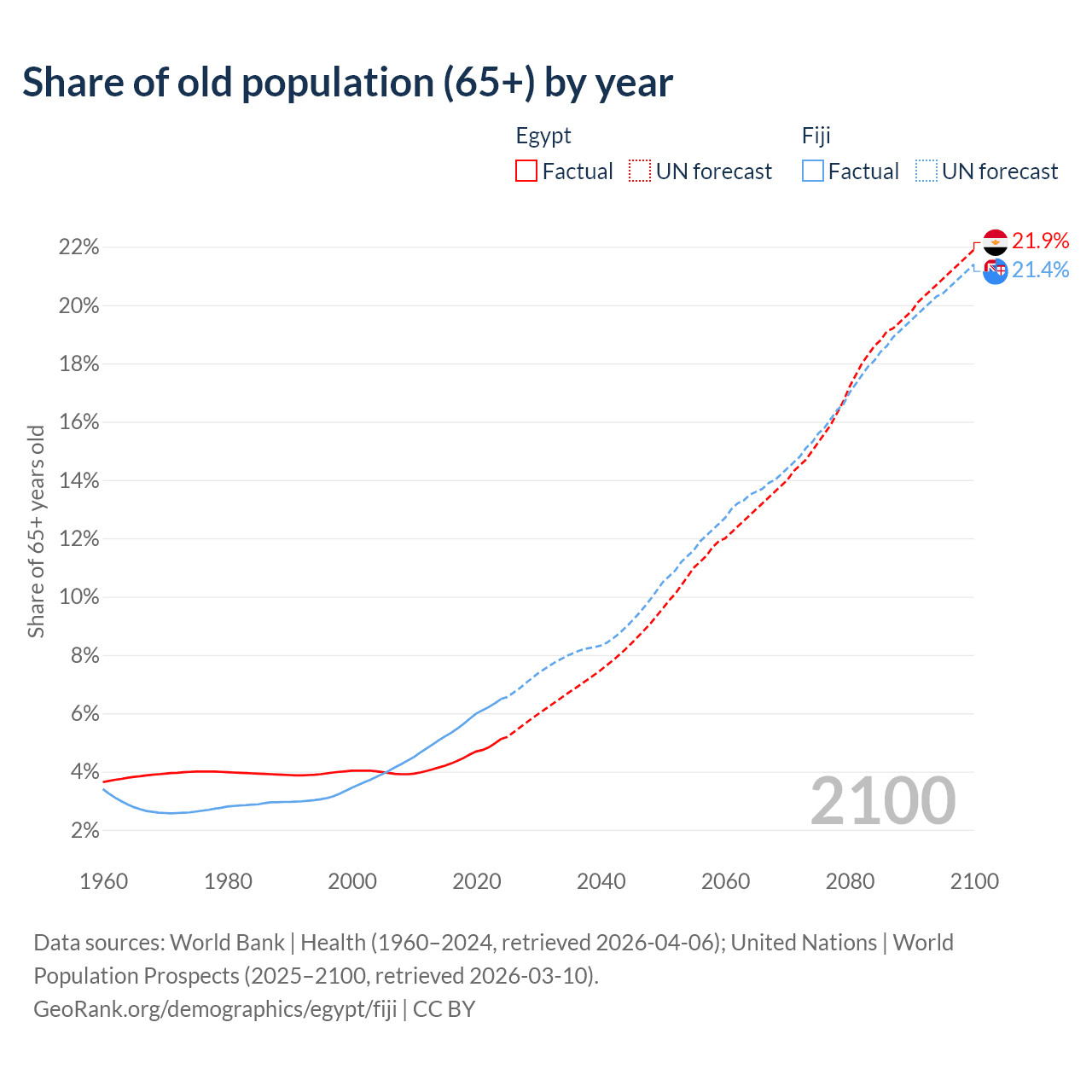 The share of older people aged 65 and over is 5.12% in Egypt and 6.49% in Fiji. Life expectancy in Egypt compared to Fiji .