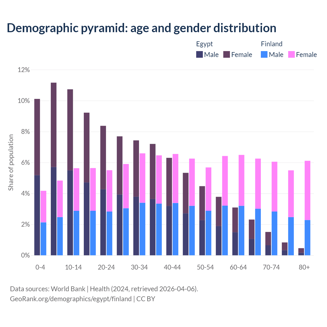 - As of 2026, the population of Egypt is 121M vs 5.63M in Finland - 21.4 times difference.