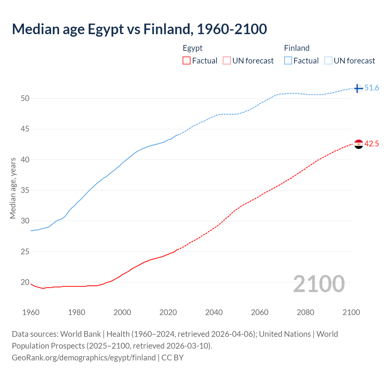 - The median age in Egypt is 25.3 years compared to 44 years in Finland.