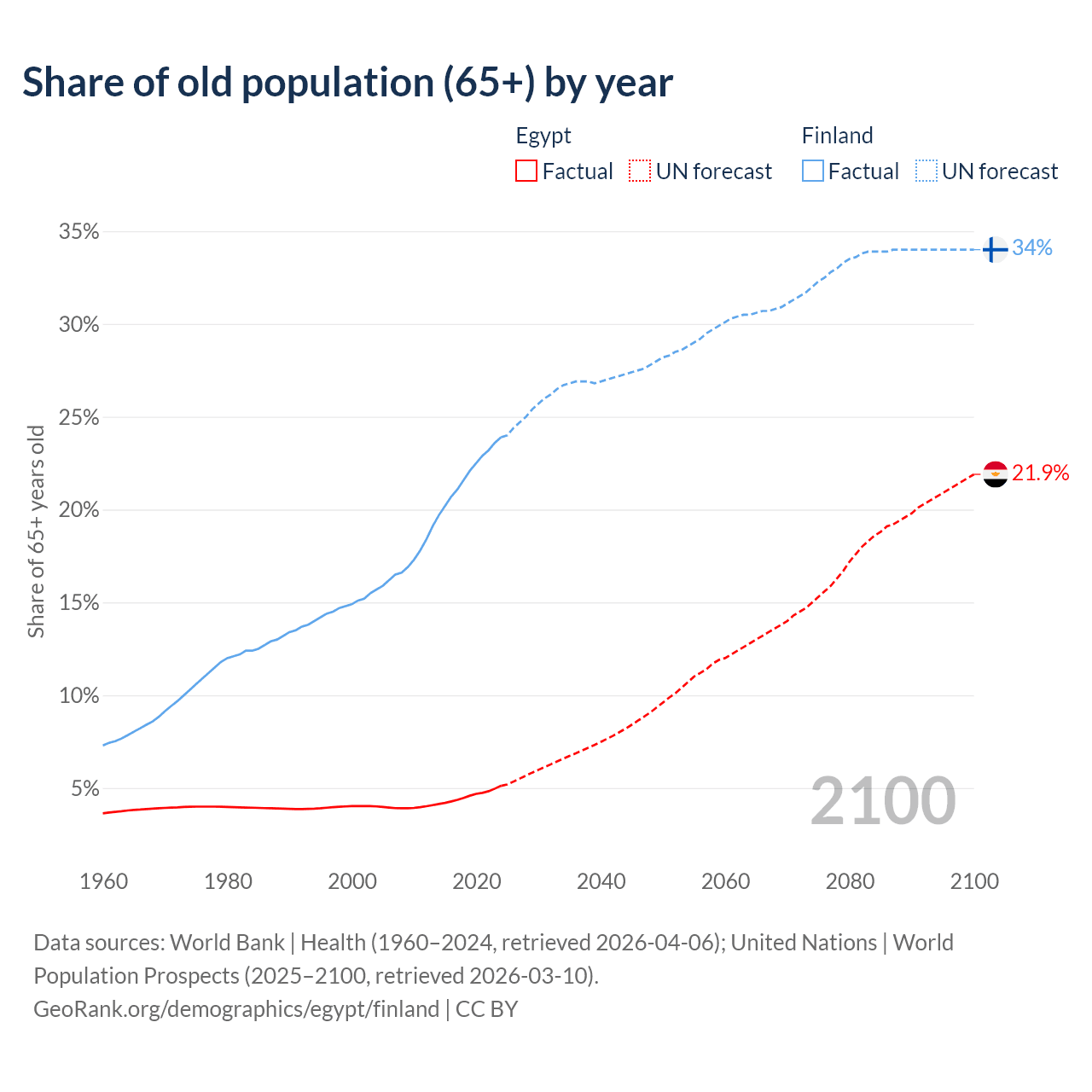 The share of older people aged 65 and over is 5.12% in Egypt and 23.9% in Finland. Life expectancy in Egypt compared to Finland .