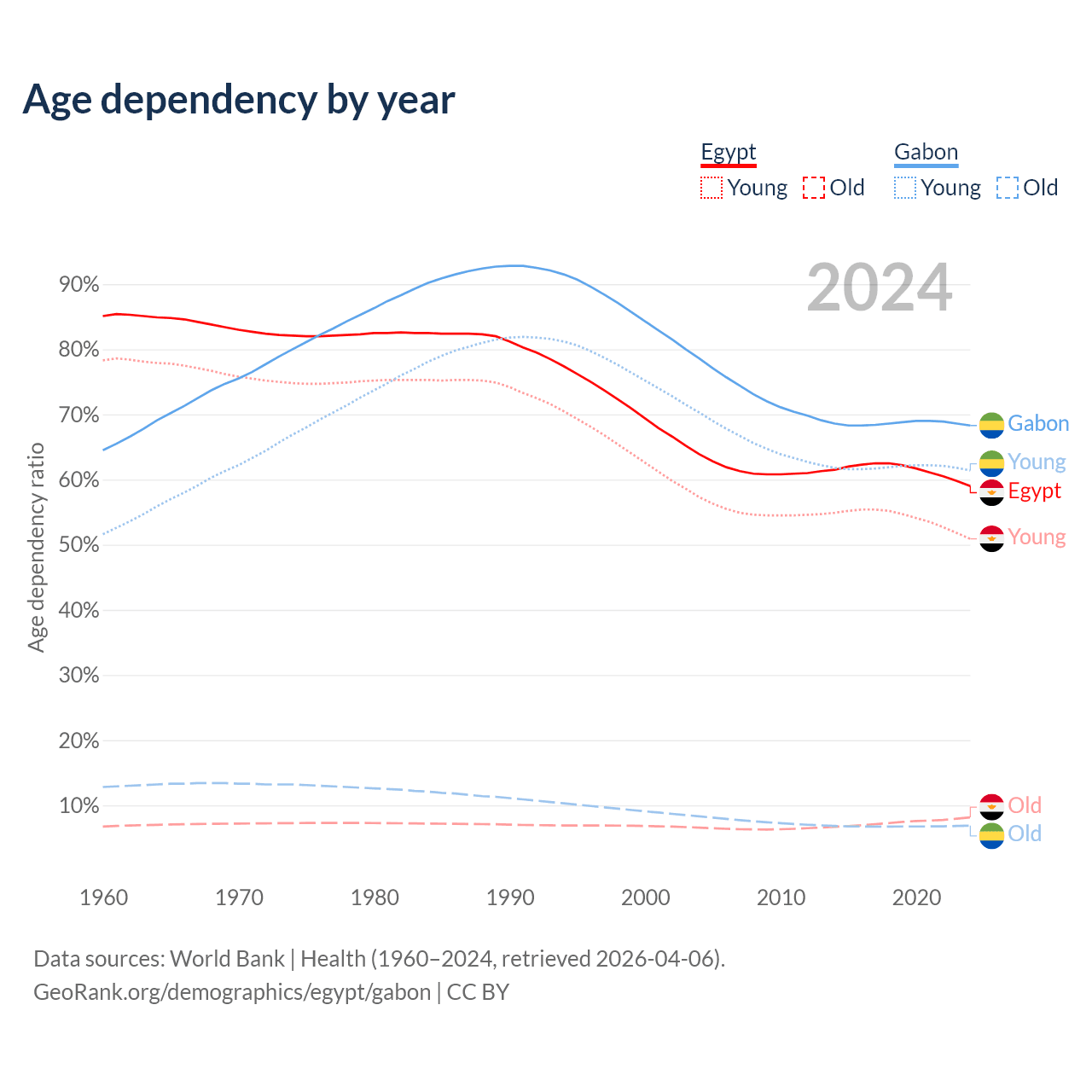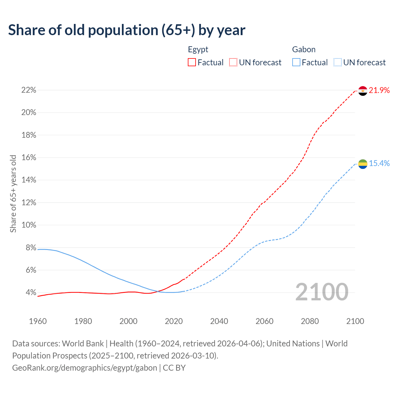 The share of older people aged 65 and over is 5.12% in Egypt and 4.08% in Gabon. Life expectancy in Egypt compared to Gabon .