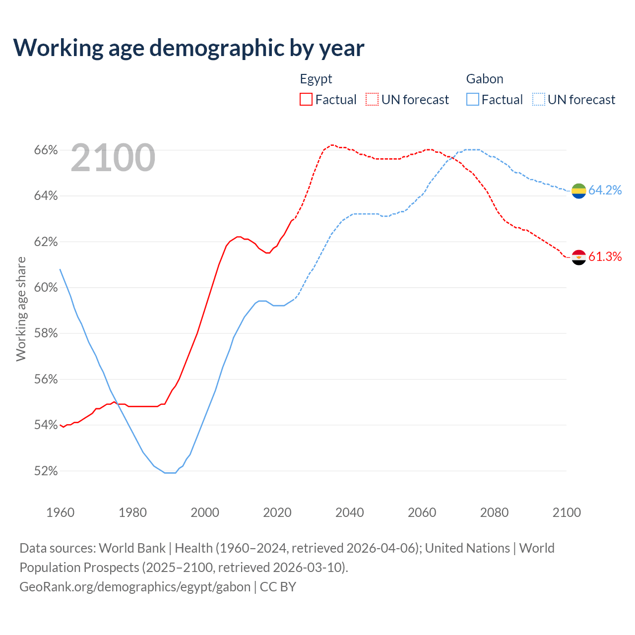- Egypt has 75.9M working age adults (aged 15-64) vs 1.58M in Gabon.
