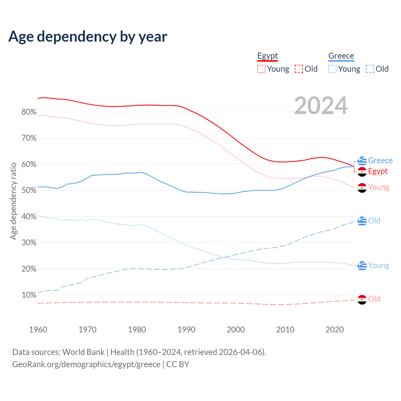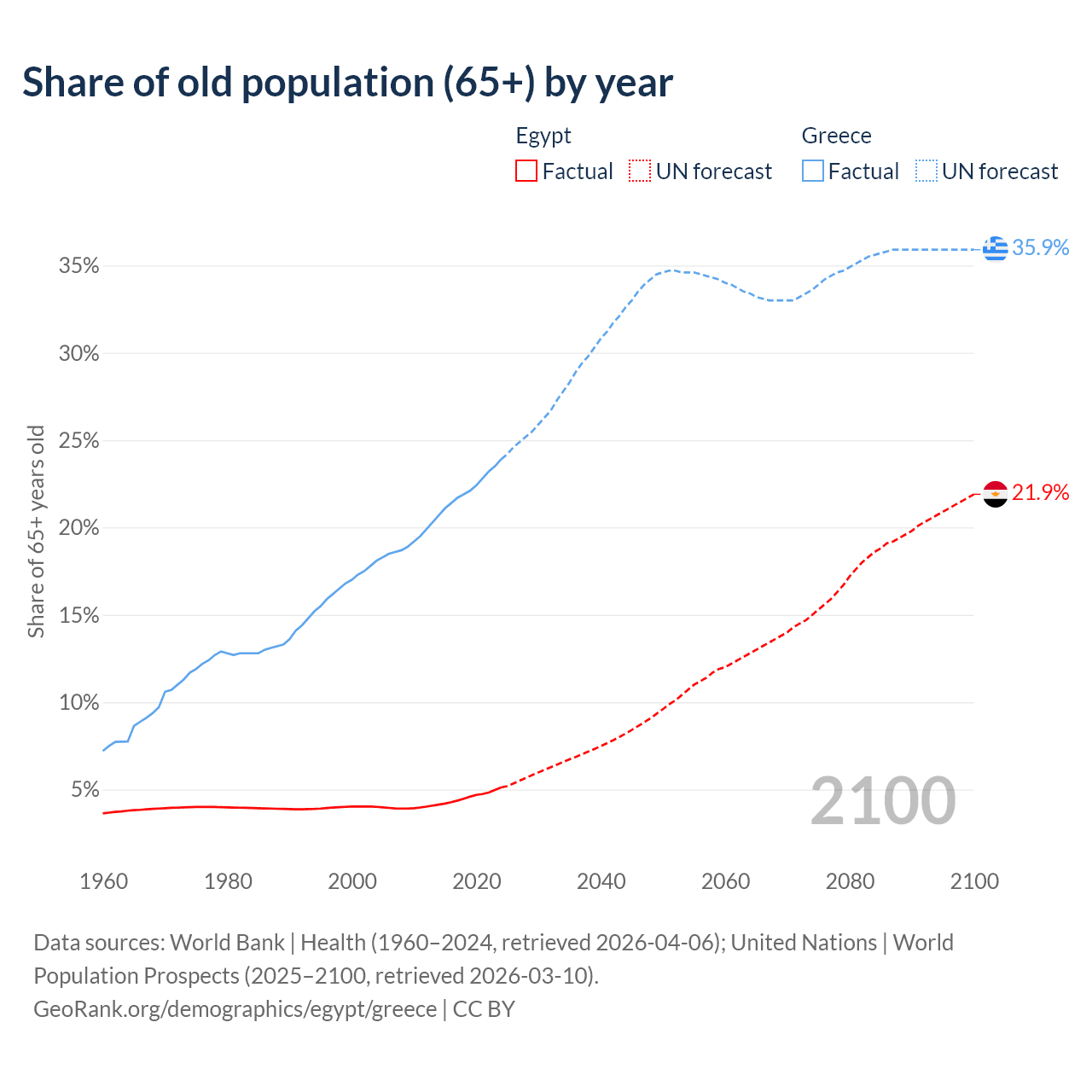 The share of older people aged 65 and over is 5.12% in Egypt and 23.9% in Greece. Life expectancy in Egypt compared to Greece .