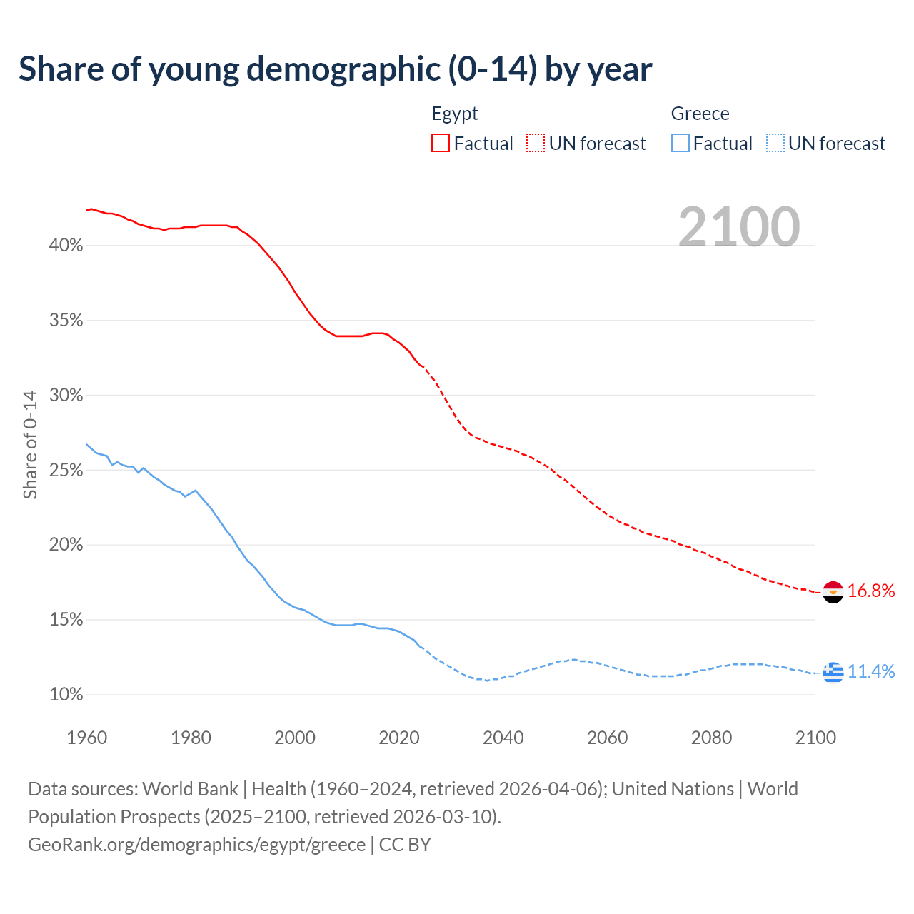 - The share of young demographic (0-15 years old) in Egypt is 32% vs 13.2% in Greece.
