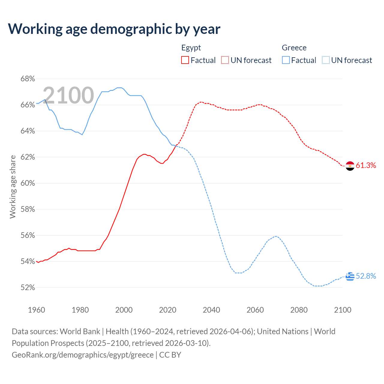 - Egypt has 75.9M working age adults (aged 15-64) vs 6.4M in Greece.
