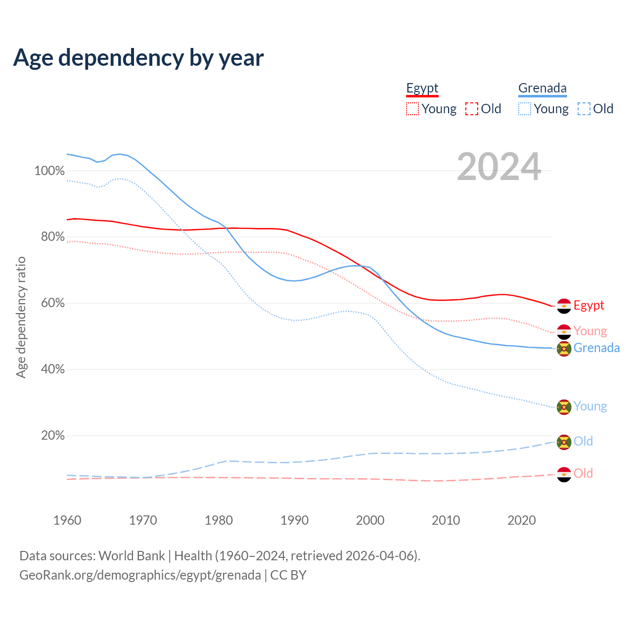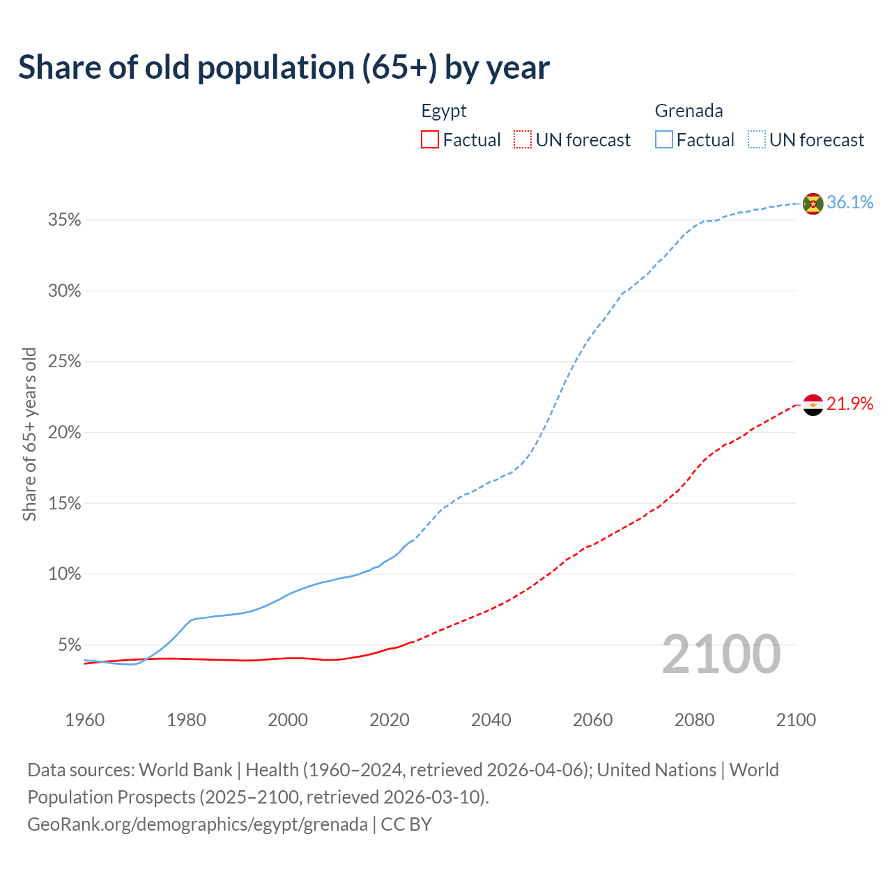 The share of older people aged 65 and over is 5.12% in Egypt and 12.2% in Grenada. Life expectancy in Egypt compared to Grenada .