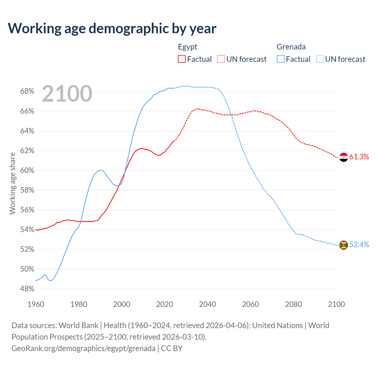 - Egypt has 75.9M working age adults (aged 15-64) vs 80.2K in Grenada.