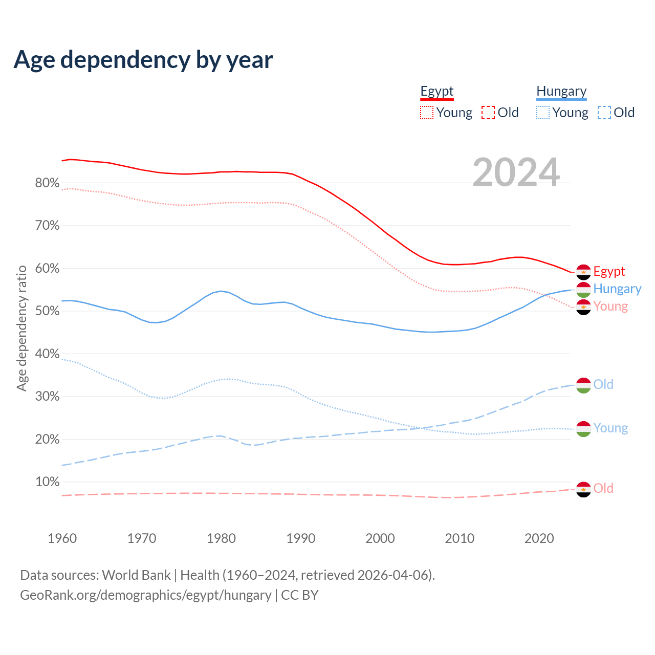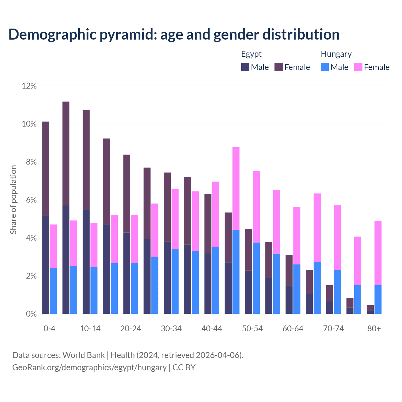 - Egypt is ranked 133/196 by median age (oldest to youngest) vs 17/196 for Hungary.
