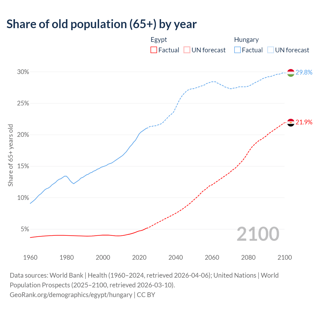 The share of older people aged 65 and over is 5.12% in Egypt and 21% in Hungary. Life expectancy in Egypt compared to Hungary .