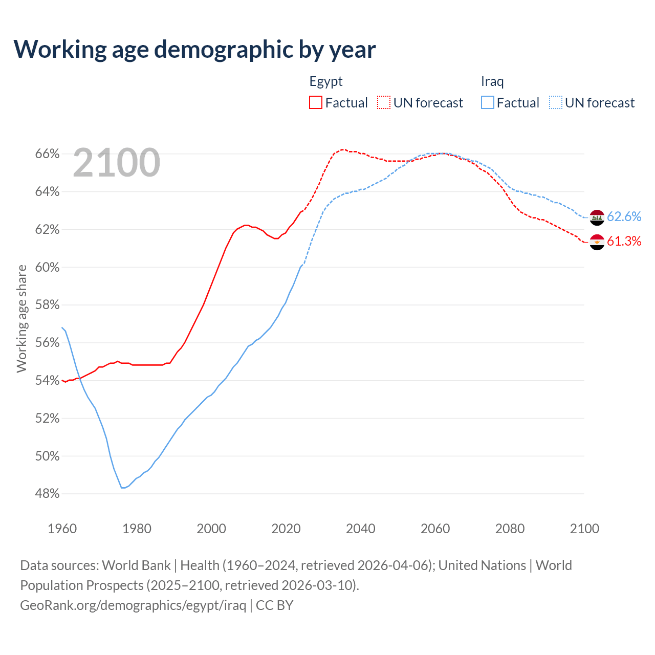 - Egypt has 75.9M working age adults (aged 15-64) vs 29M in Iraq.