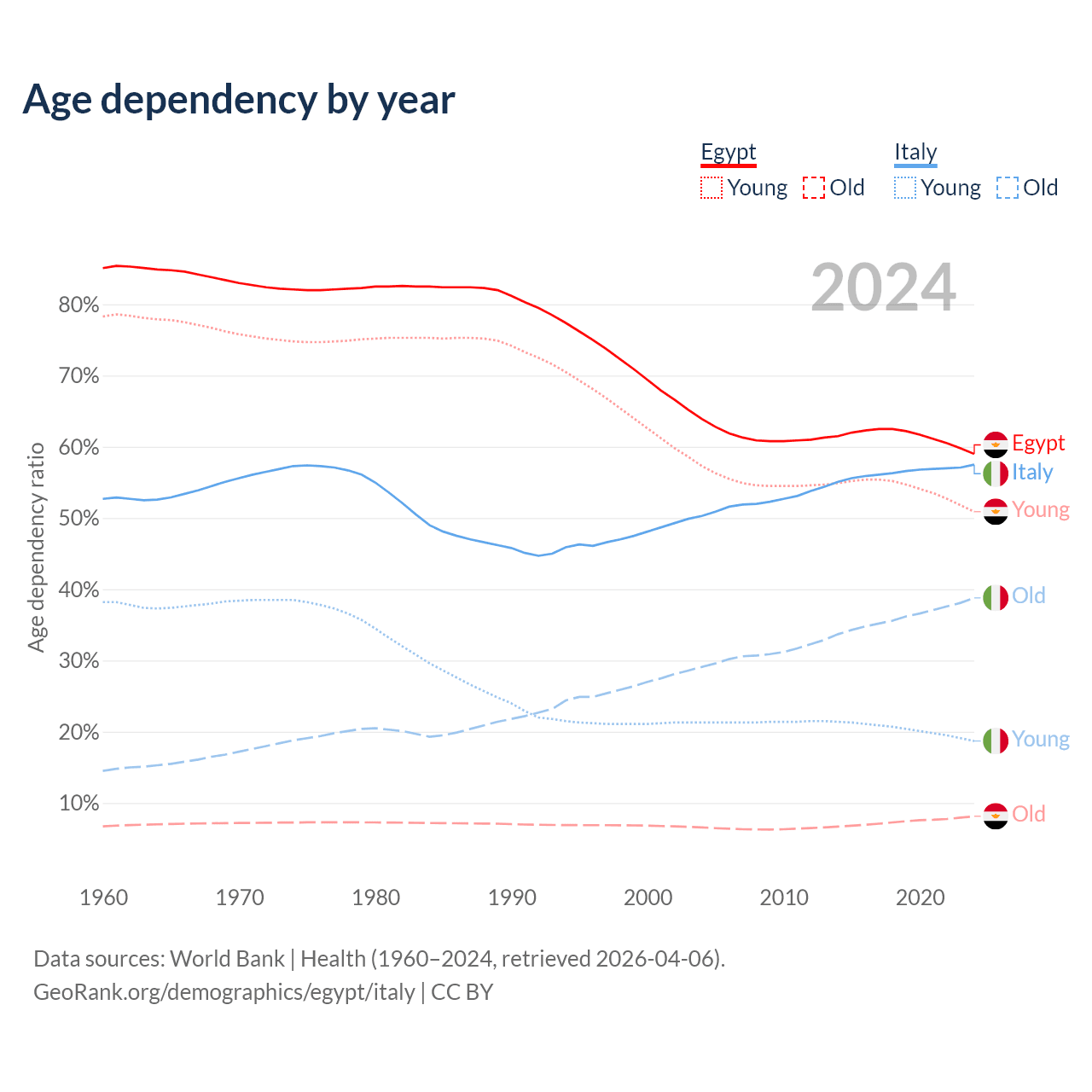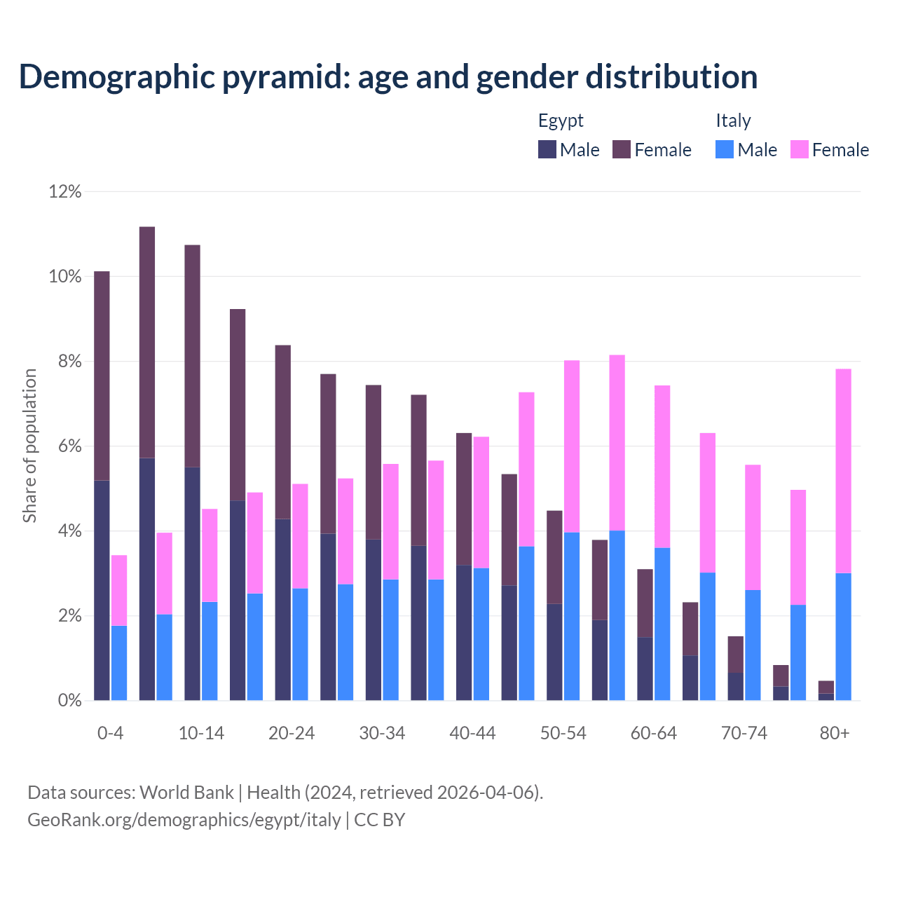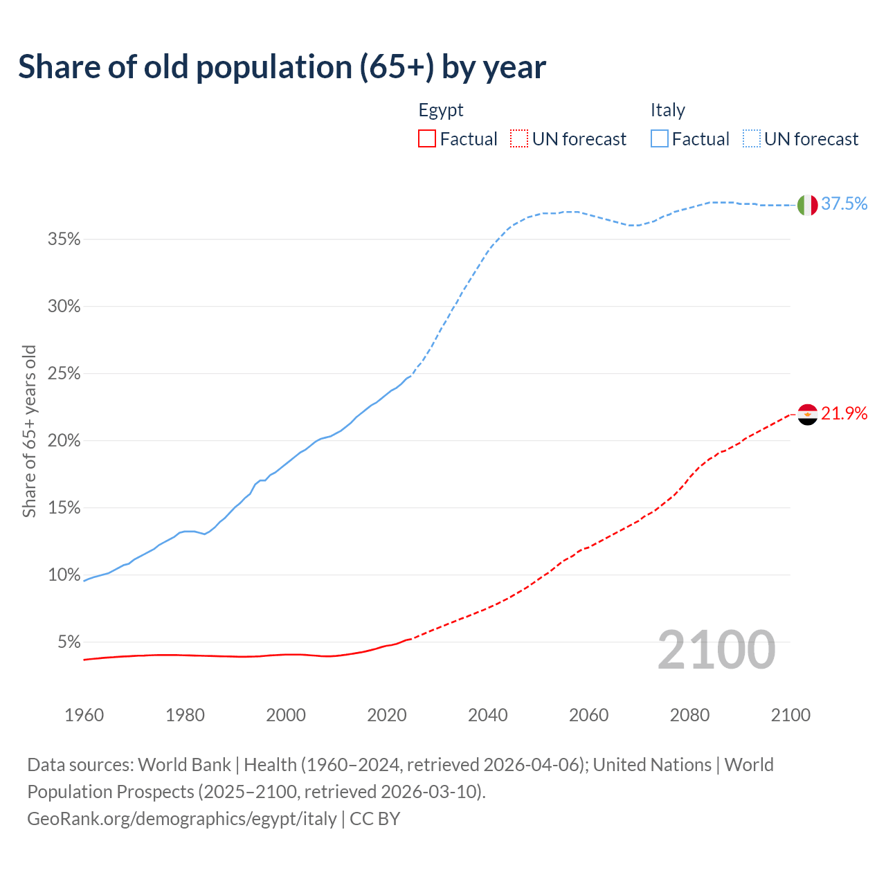 The share of older people aged 65 and over is 5.12% in Egypt and 24.6% in Italy. Life expectancy in Egypt compared to Italy .