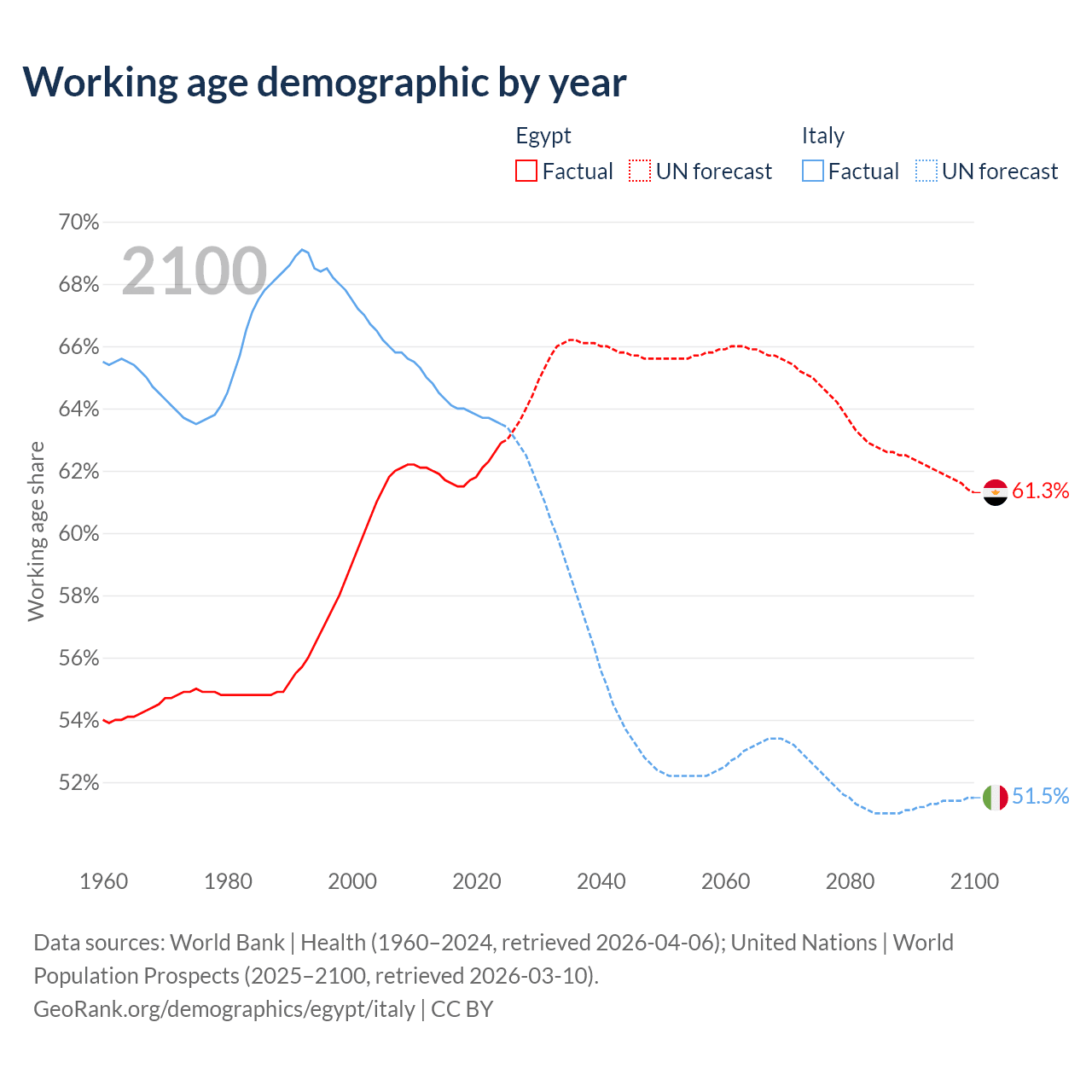 - Egypt has 75.9M working age adults (aged 15-64) vs 37.2M in Italy.