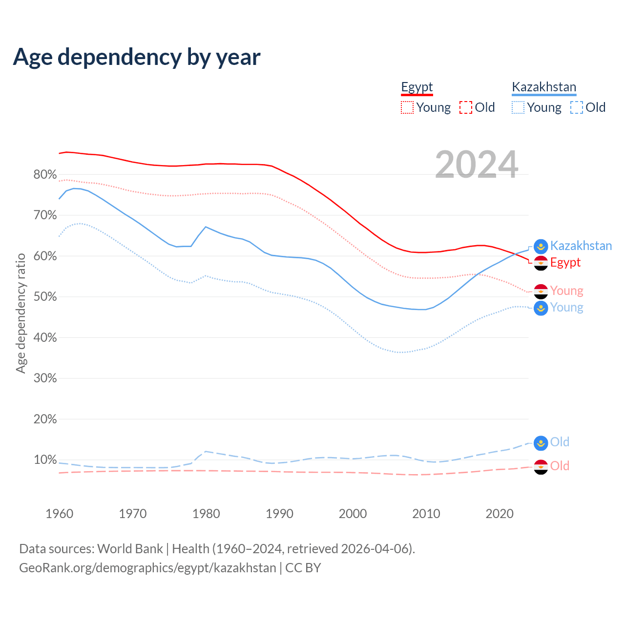 - Egypt is ranked 133/196 by median age (oldest to youngest) vs 99/196 for Kazakhstan.