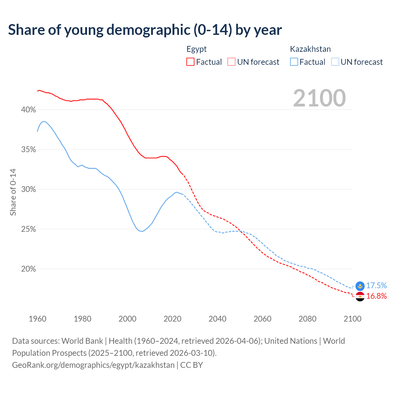 - As of 2026, the population of Egypt is 121M vs 21.2M in Kazakhstan - 5.7 times difference.