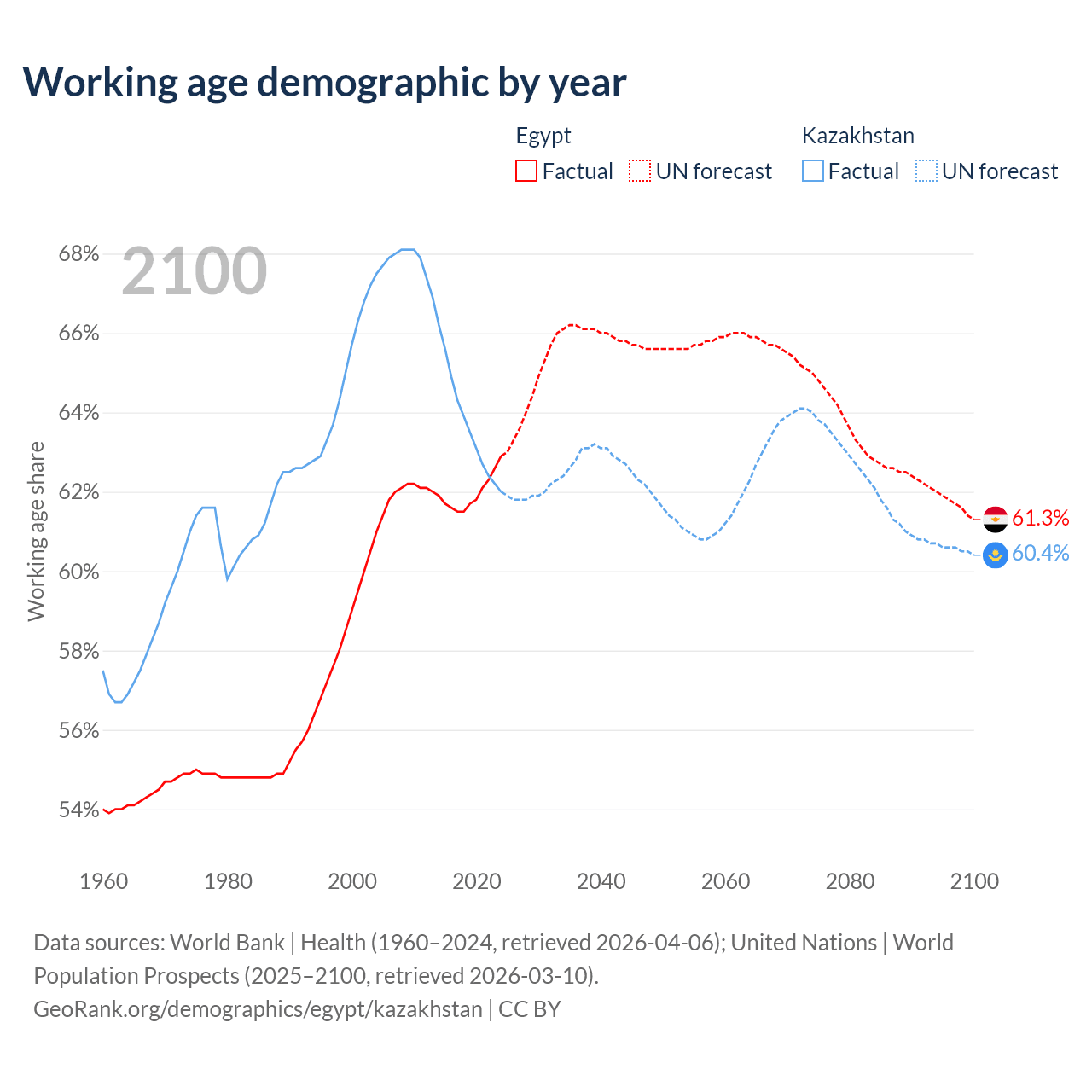 - Egypt has 75.9M working age adults (aged 15-64) vs 13.1M in Kazakhstan.
