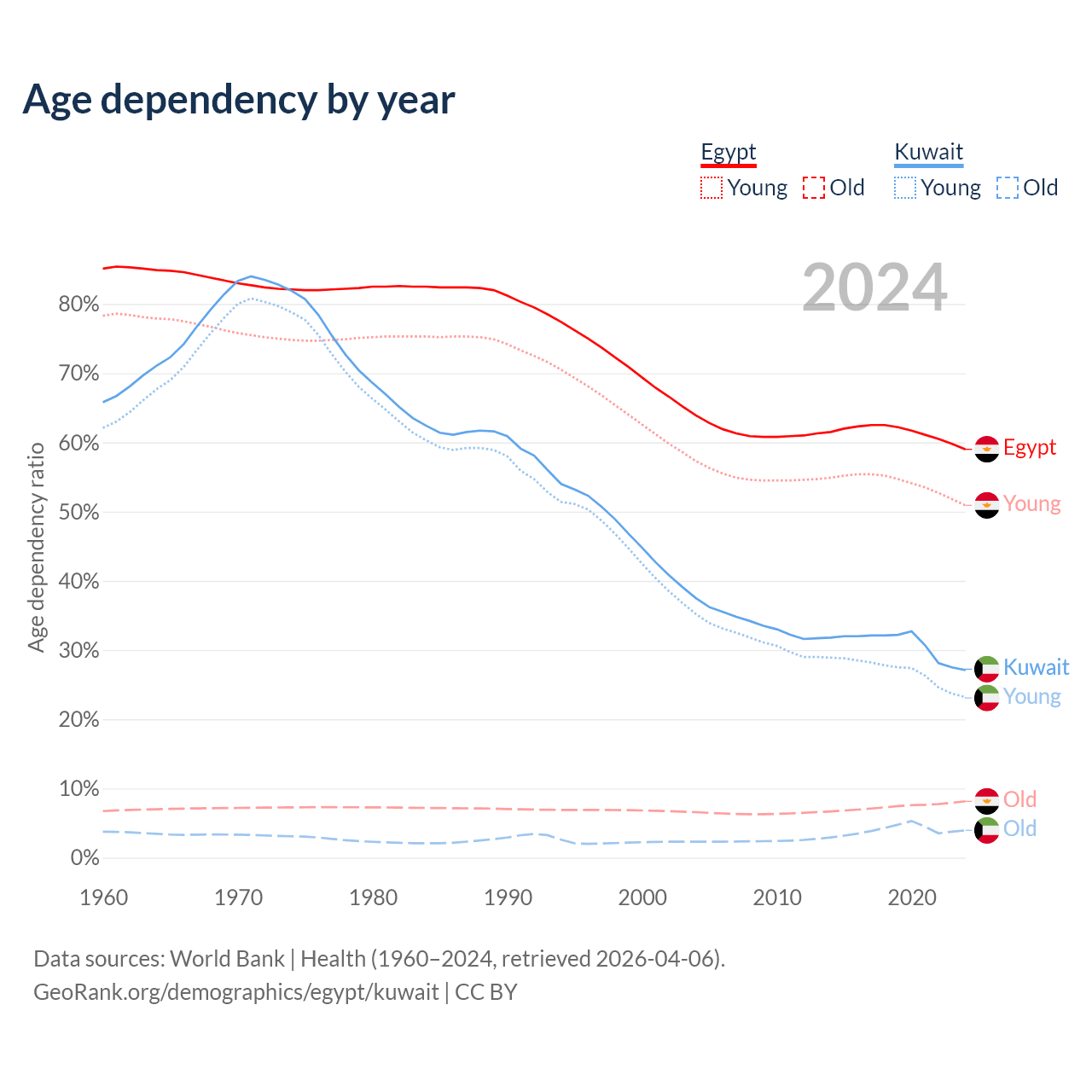 Data sources: World Bank | Health (1960–2024, retrieved 2026-04-06); U.S. Census Bureau (1960–2024, retrieved 2026-02-08).
