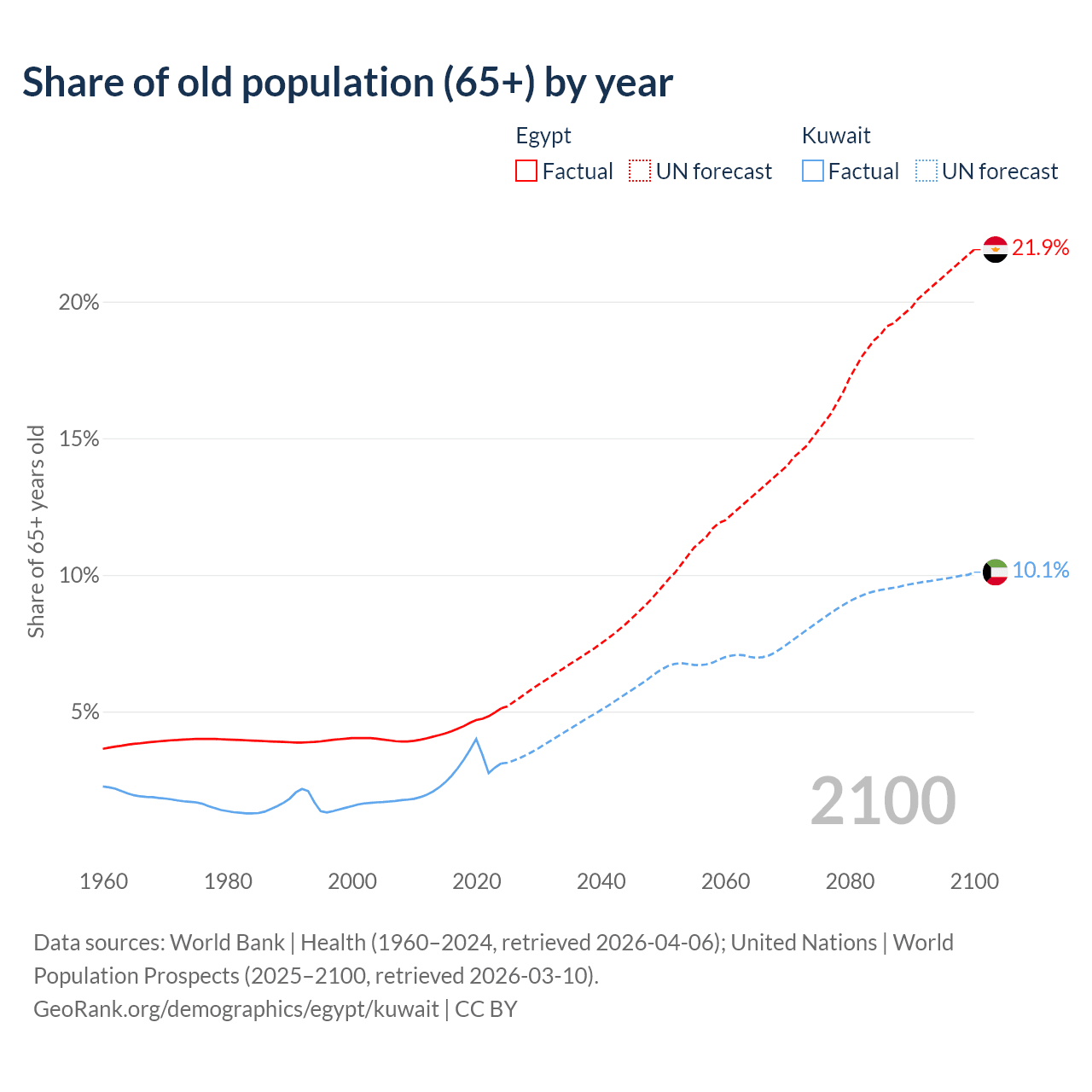 The share of older people aged 65 and over is 5.12% in Egypt and 3.1% in Kuwait. Life expectancy in Egypt compared to Kuwait .