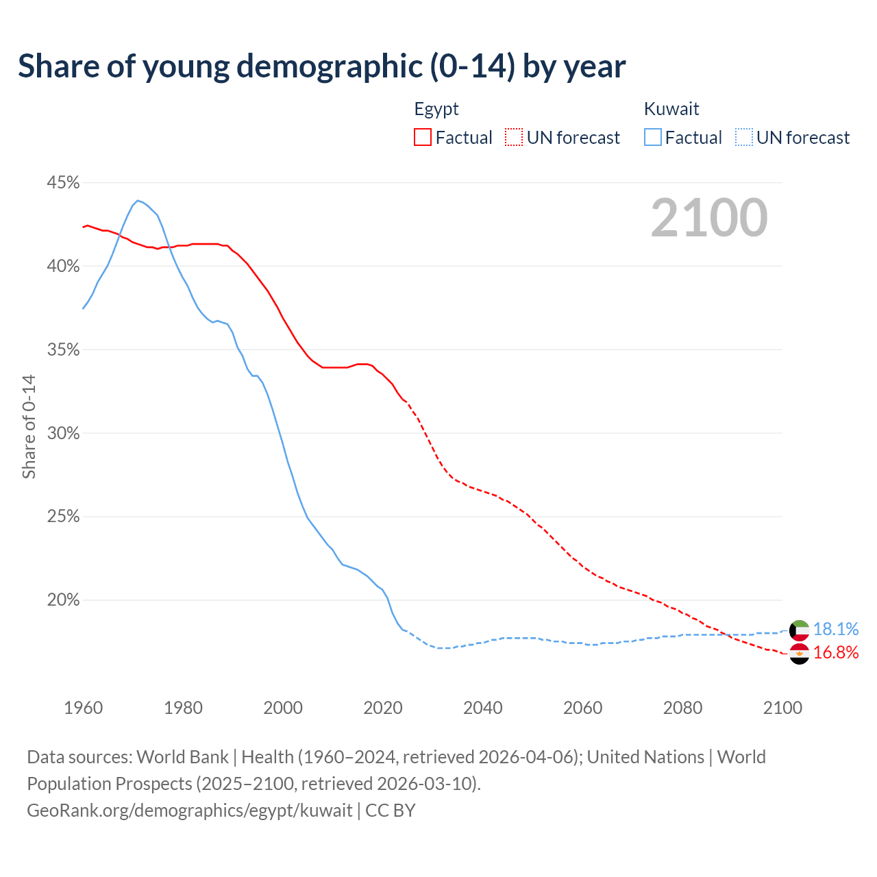 - The share of young demographic (0-15 years old) in Egypt is 32% vs 18.2% in Kuwait.