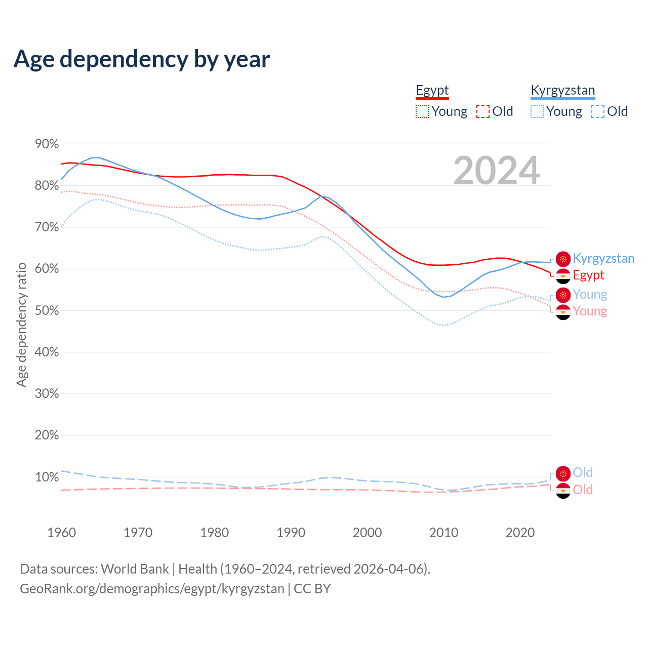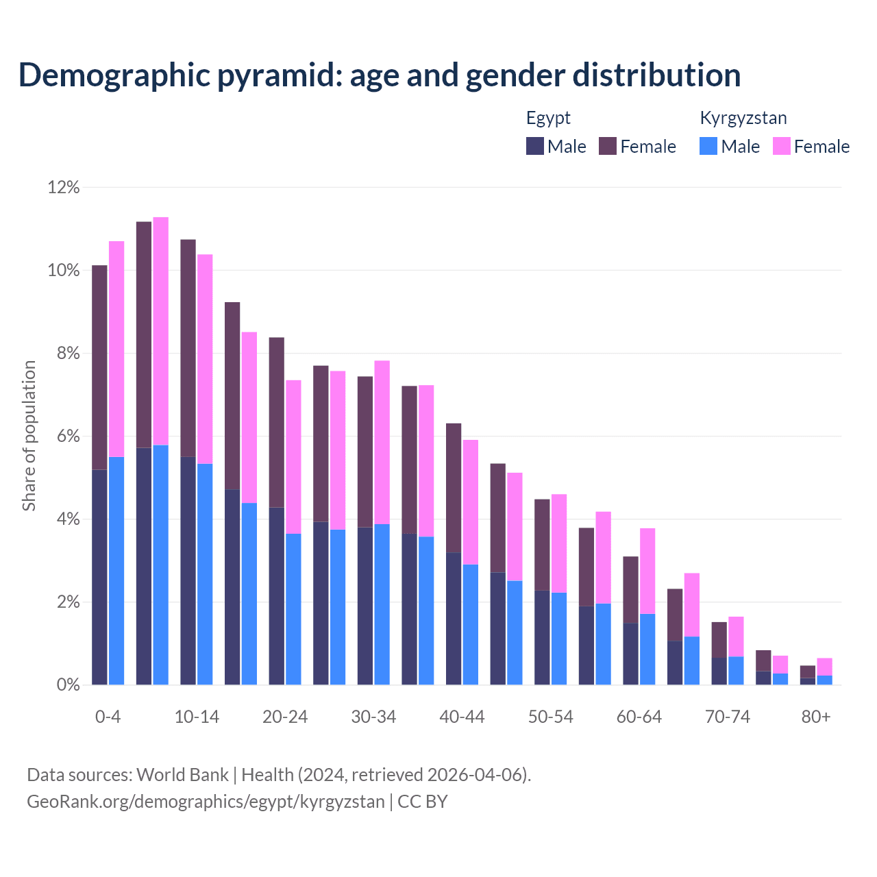 - The share of old-age demographic (65+) in Egypt is 5.12% vs 5.68% in Kyrgyzstan.