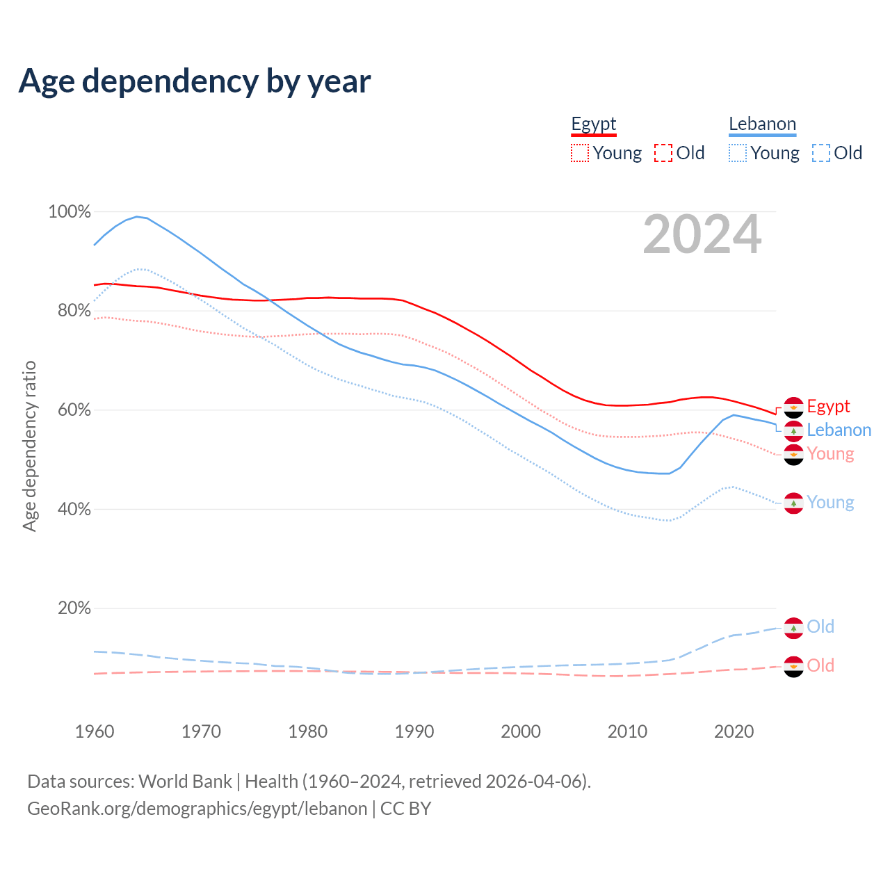 - Egypt is ranked 133/196 by median age (oldest to youngest) vs 106/196 for Lebanon.