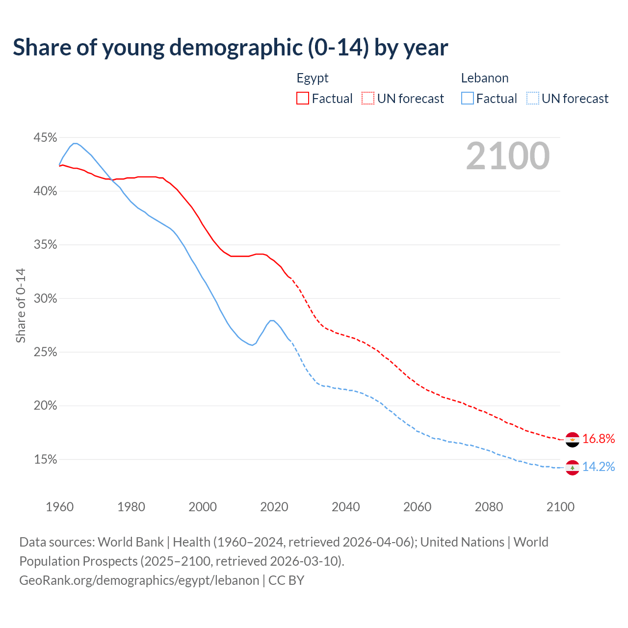 - As of 2026, the population of Egypt is 121M vs 5.91M in Lebanon - 20.4 times difference.
