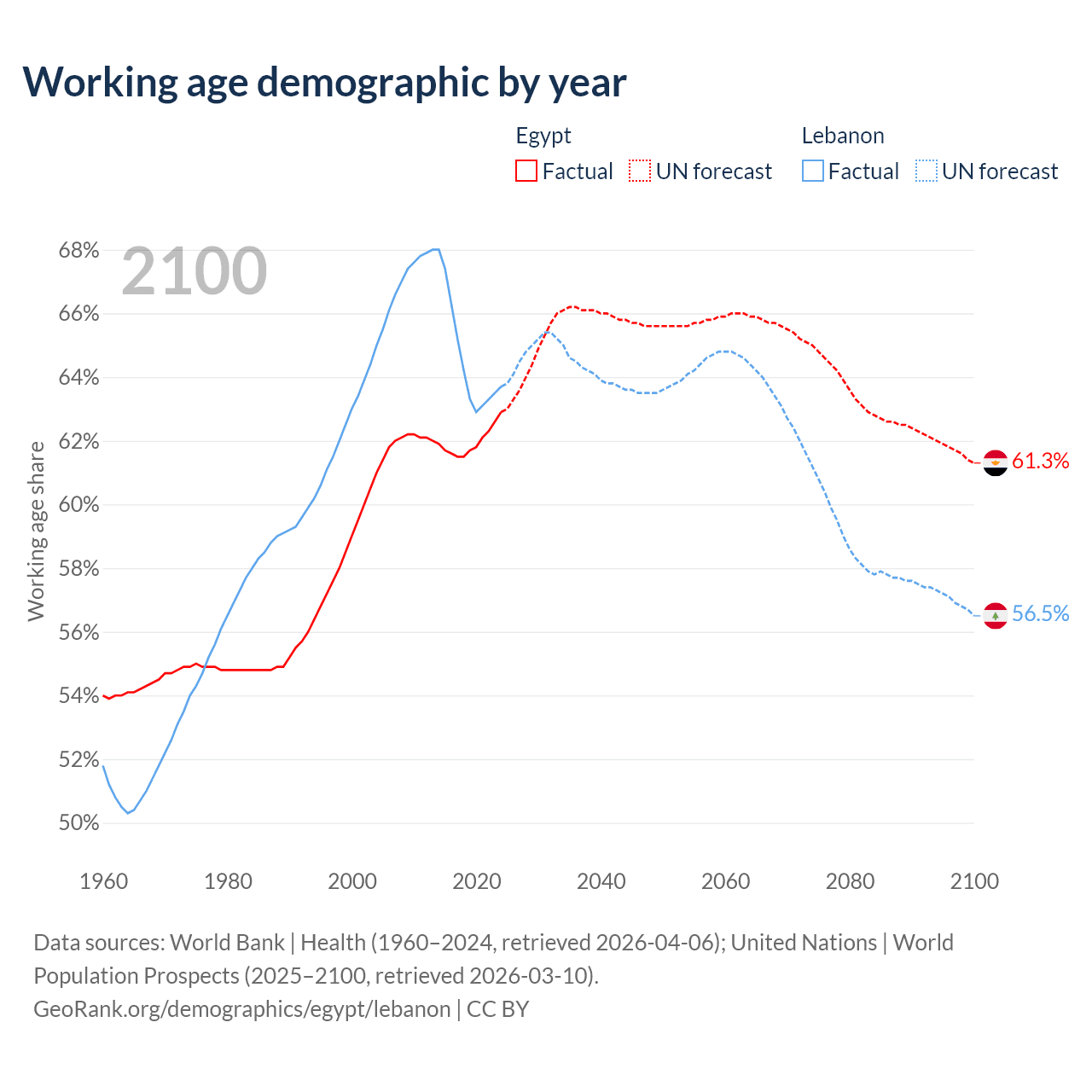 - Egypt has 75.9M working age adults (aged 15-64) vs 3.76M in Lebanon.