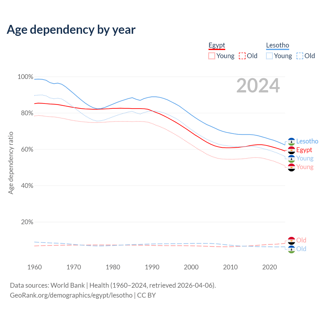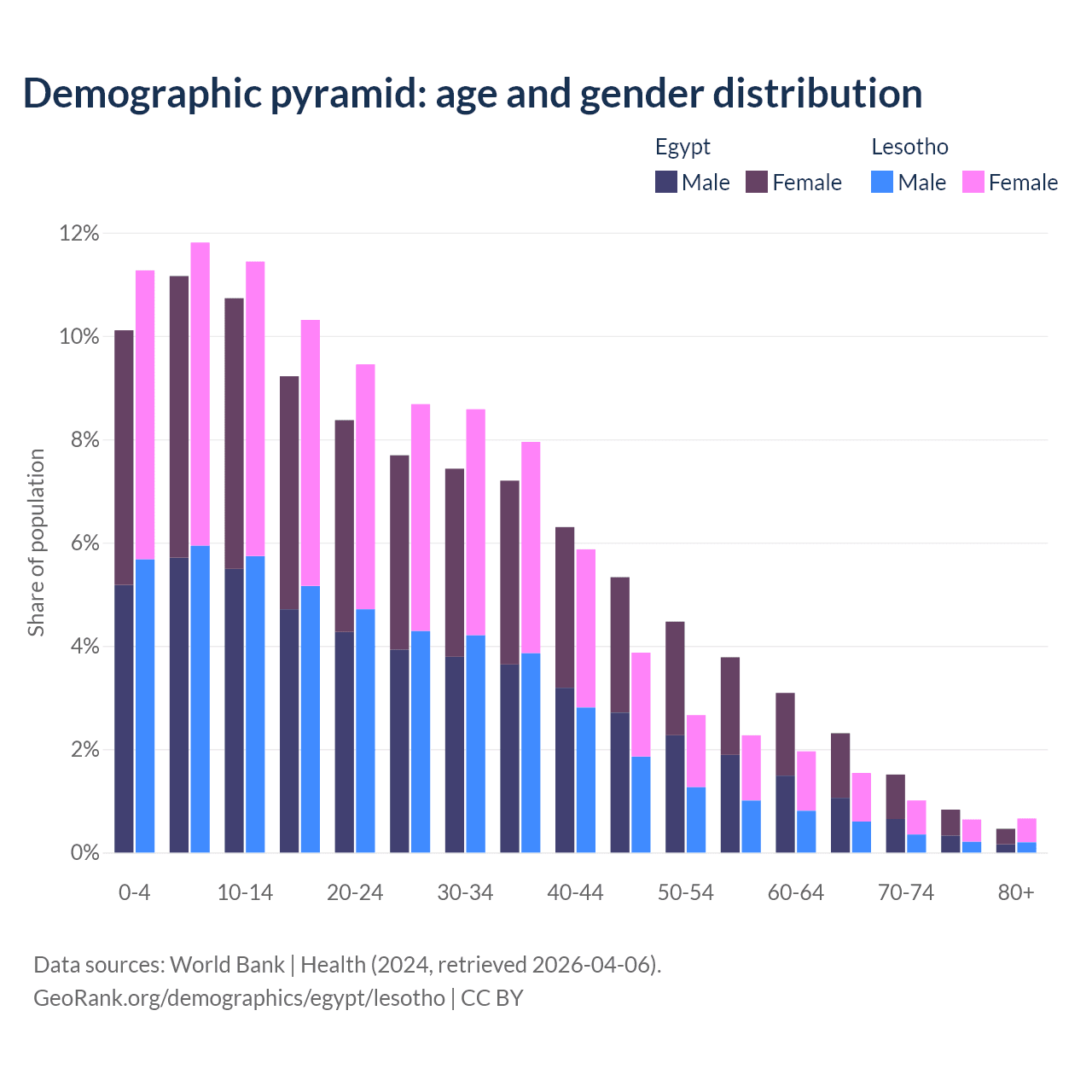 - Egypt is ranked 133/196 by median age (oldest to youngest) vs 143/196 for Lesotho.
