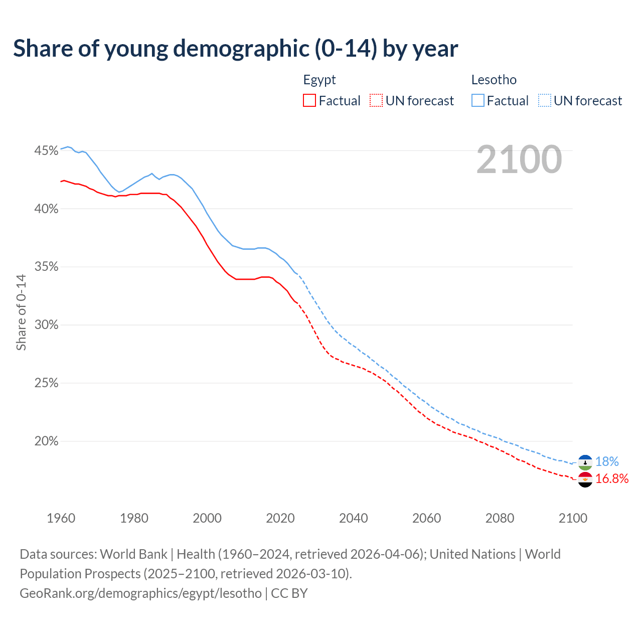 - The share of young demographic (0-15 years old) in Egypt is 32% vs 34.5% in Lesotho.