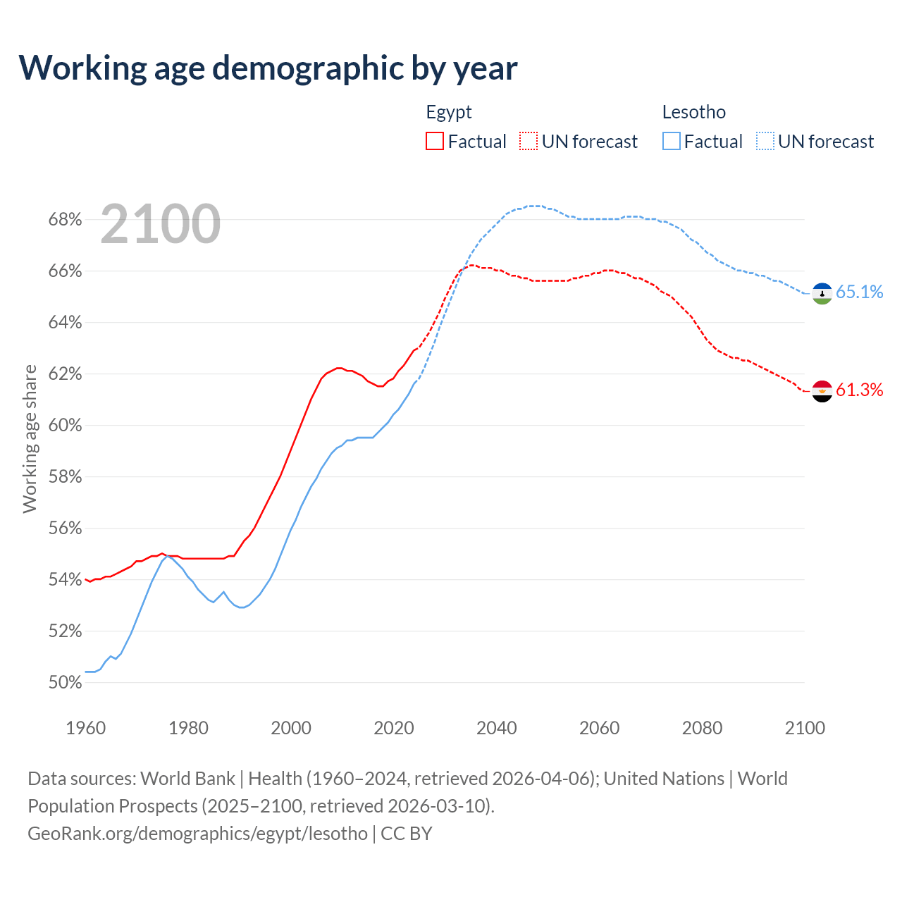 - Egypt has 75.9M working age adults (aged 15-64) vs 1.48M in Lesotho.