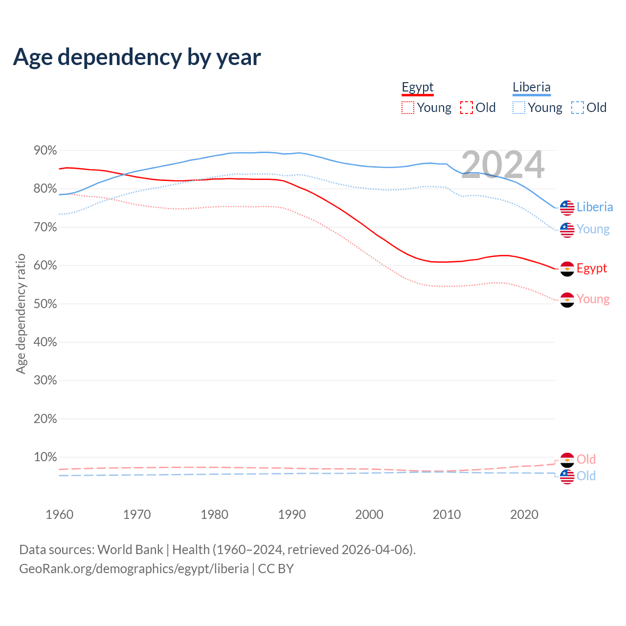 The share of older people aged 65 and over is 5.12% in Egypt and 3.3% in Liberia. Life expectancy in Egypt compared to Liberia .