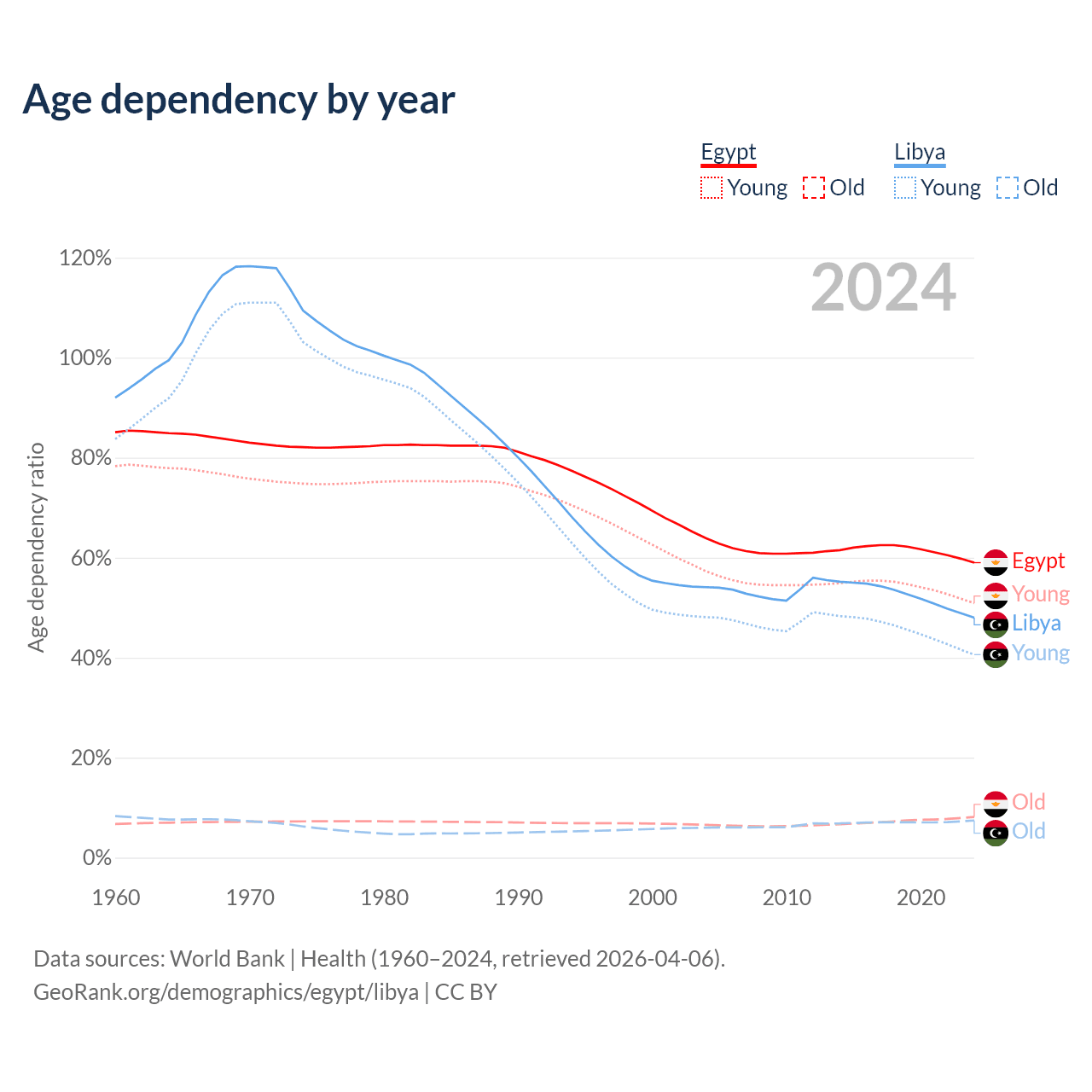 Data sources: World Bank | Health (1960–2024, retrieved 2026-04-06); U.S. Census Bureau (1960–2024, retrieved 2026-02-08).