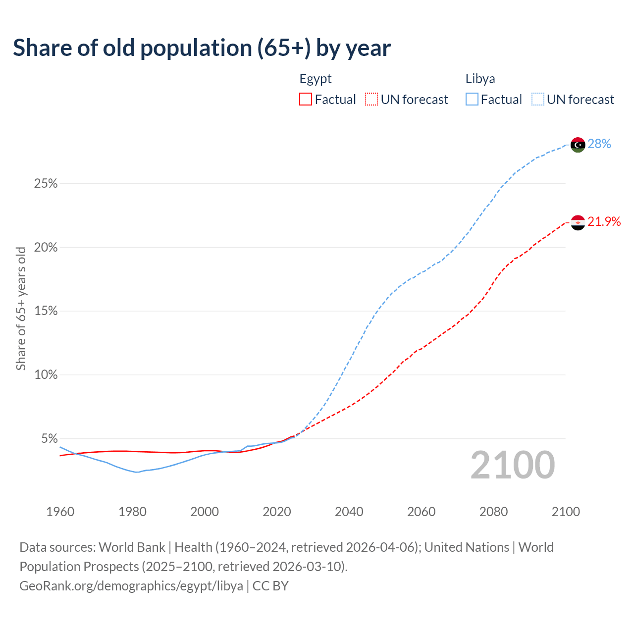 The share of older people aged 65 and over is 5.12% in Egypt and 5.02% in Libya. Life expectancy in Egypt compared to Libya .