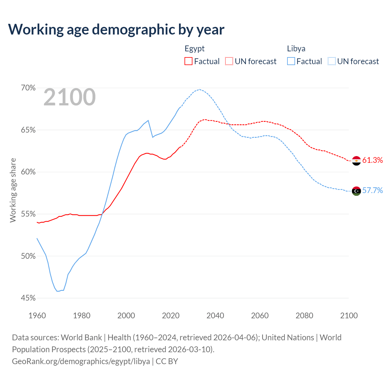 - Egypt has 75.9M working age adults (aged 15-64) vs 5.11M in Libya.