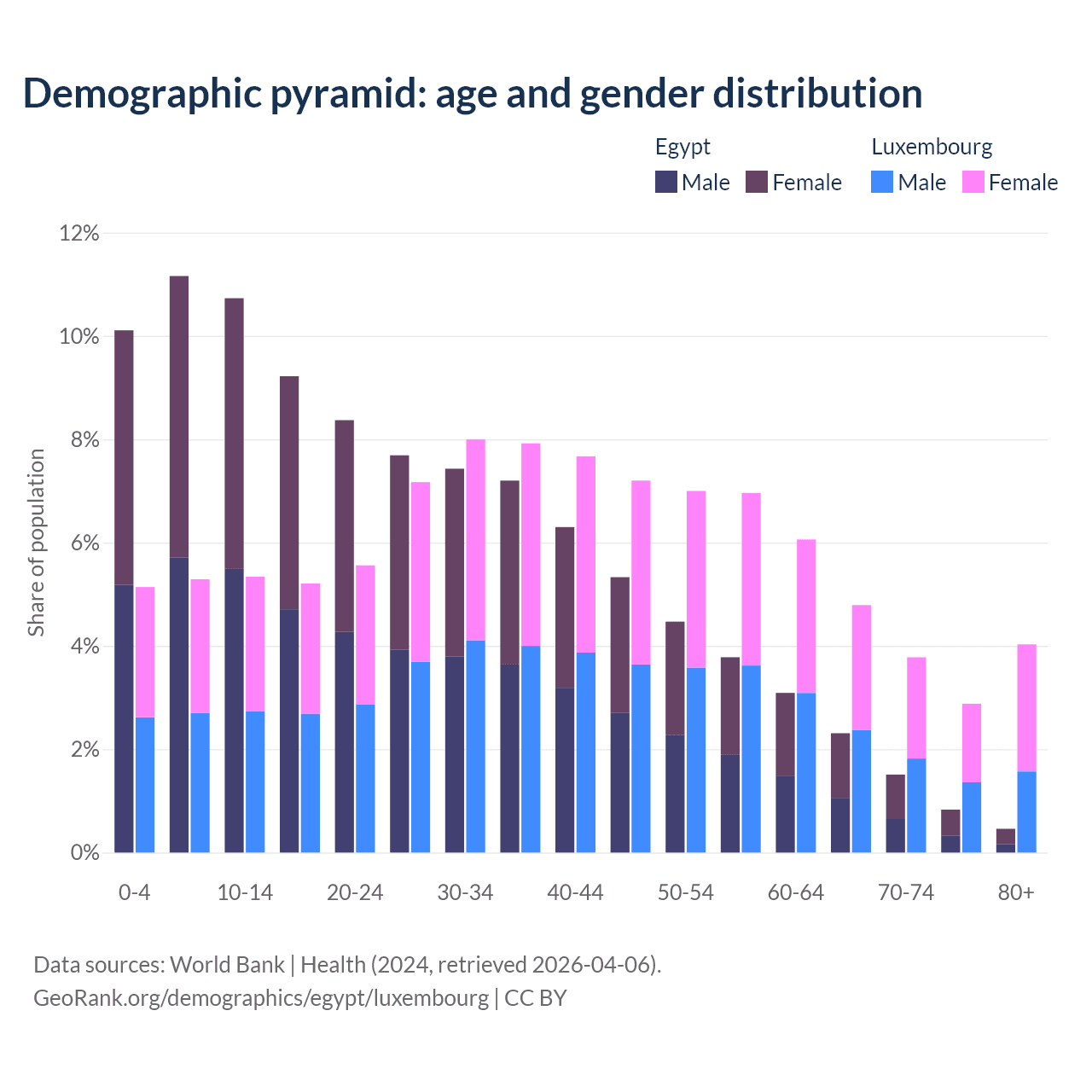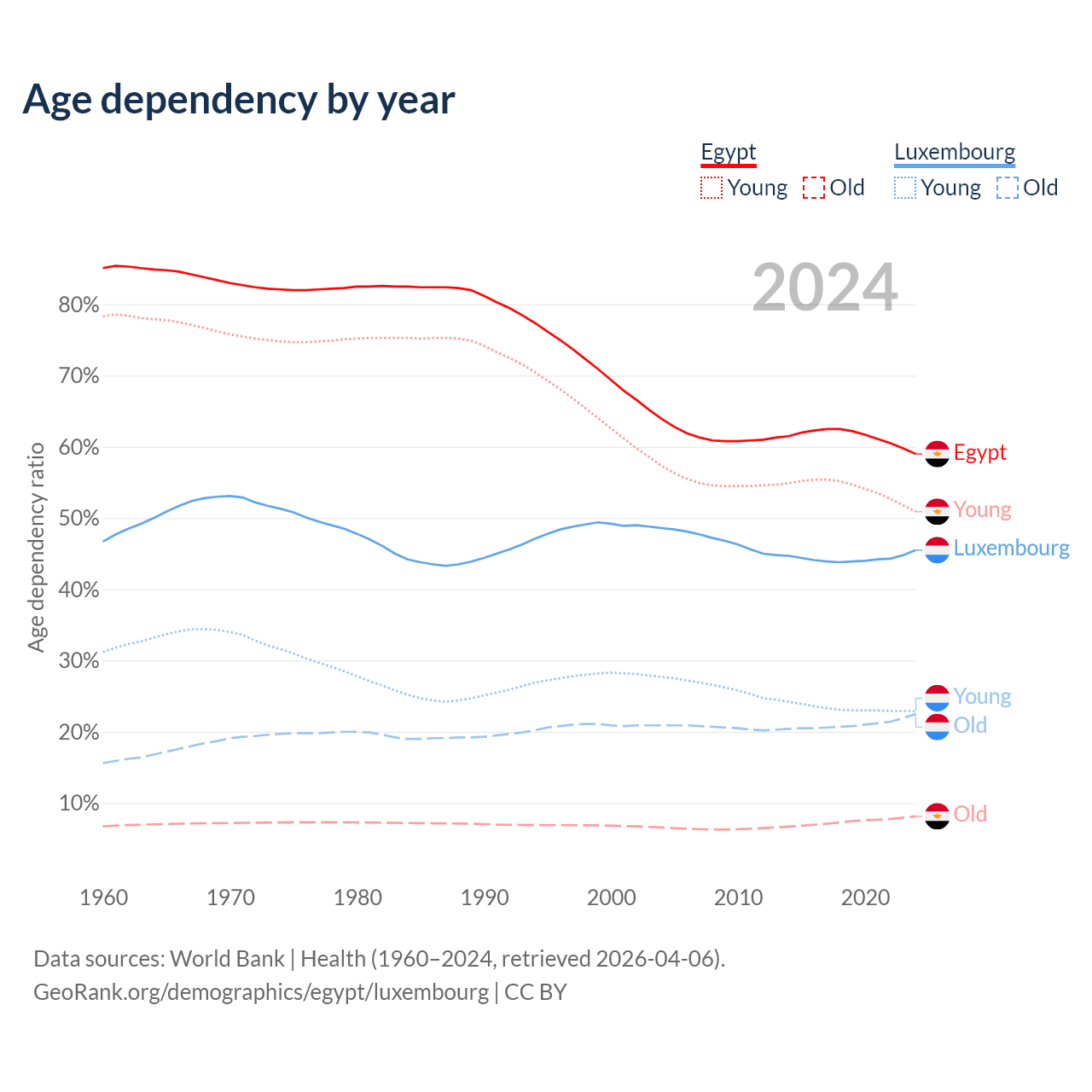 The share of older people aged 65 and over is 5.12% in Egypt and 15.5% in Luxembourg. Life expectancy in Egypt compared to Luxembourg .