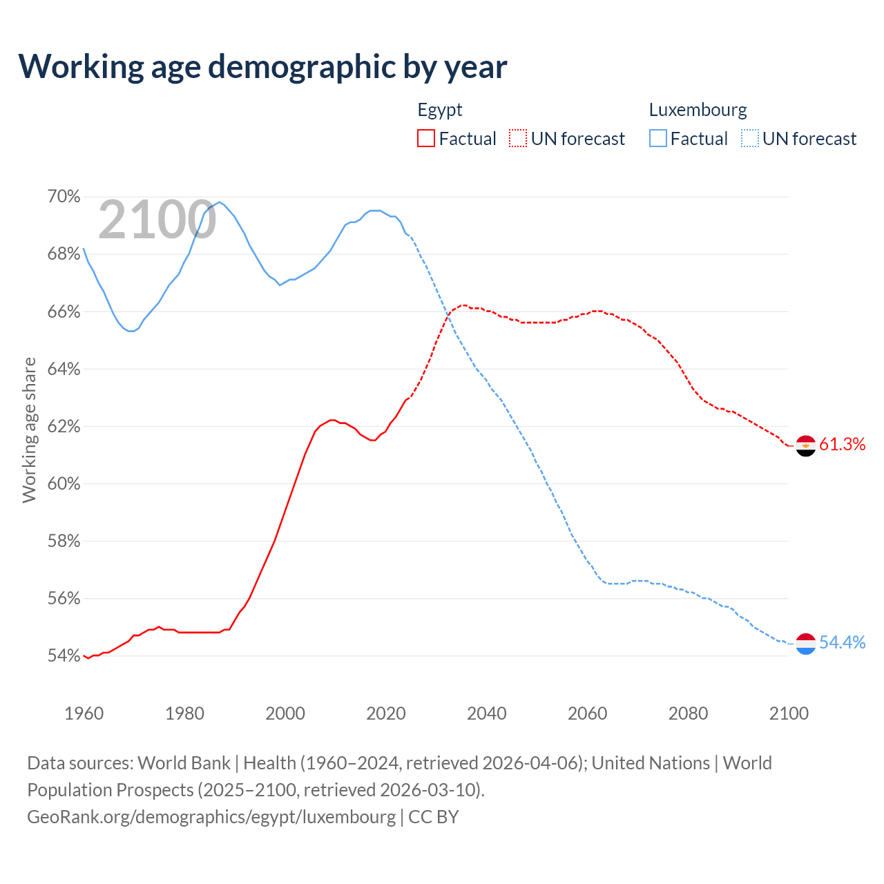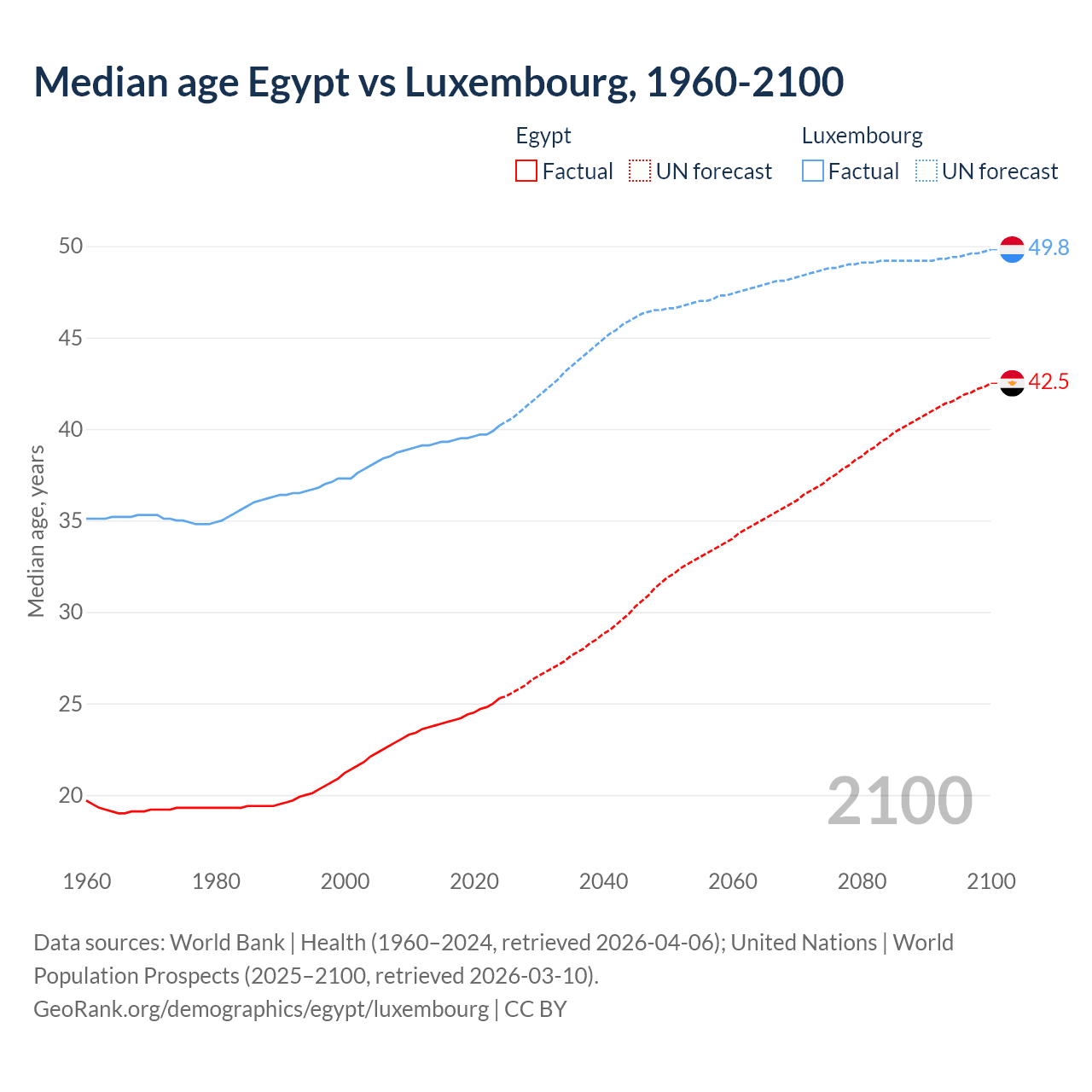 Median age Egypt vs Luxembourg, 1960-2100