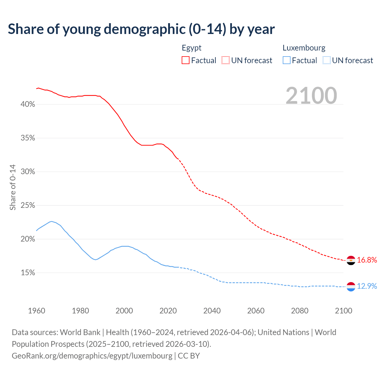 - The share of young demographic (0-15 years old) in Egypt is 32% vs 15.8% in Luxembourg.