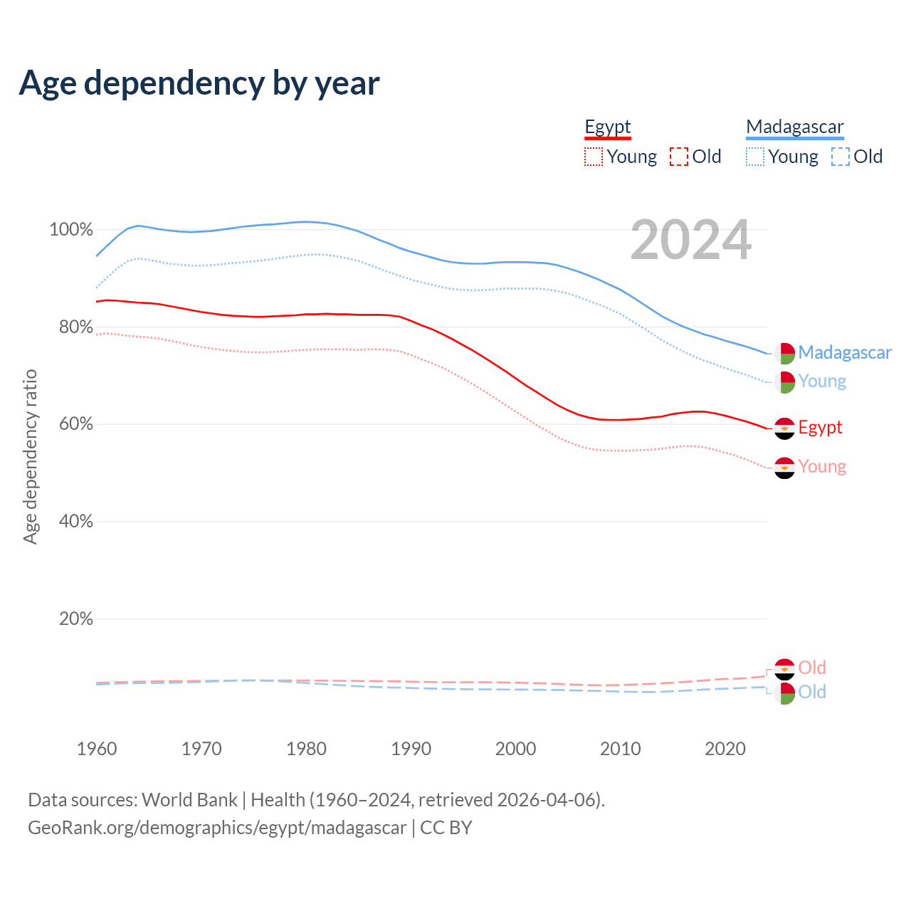 - Egypt is ranked 133/196 by median age (oldest to youngest) vs 165/196 for Madagascar.